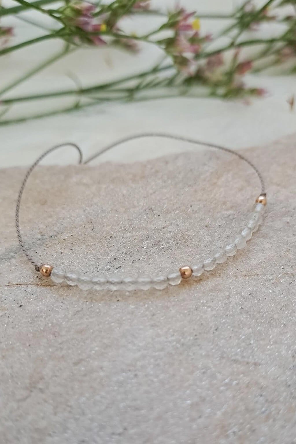Fazetované korálky priezračného krištáľu na šedej šnúrke z hodvábu.