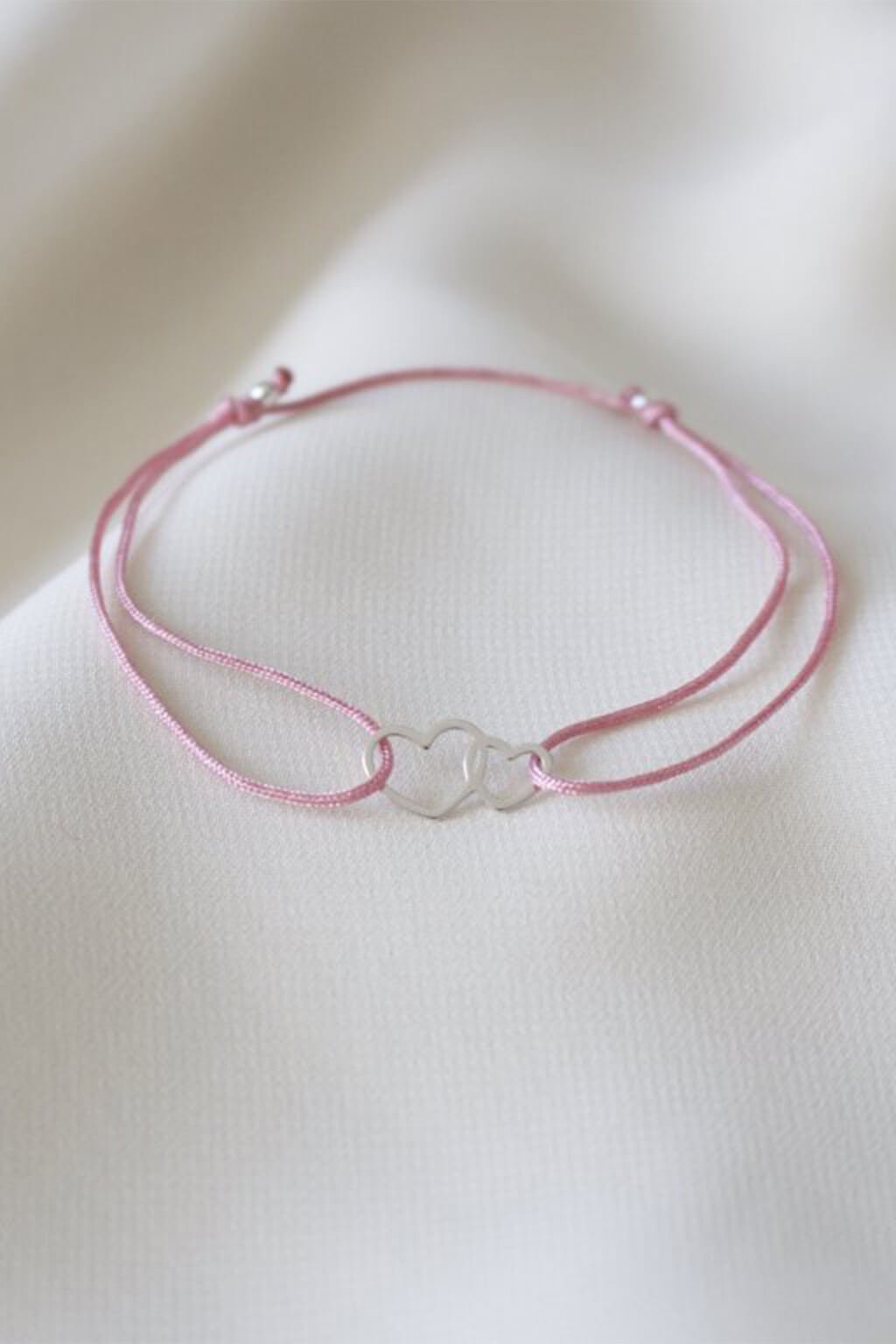 Náramok s dvoma prepojenými striebornými srdcami na jemnej šnúrke ako krásny symbol pevného spojenia dvoch duší.