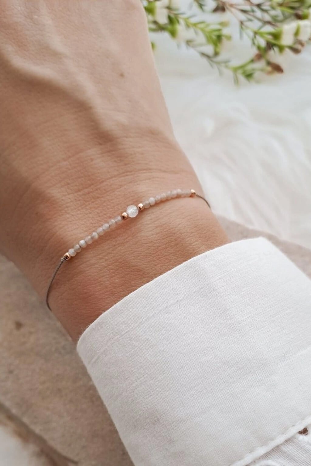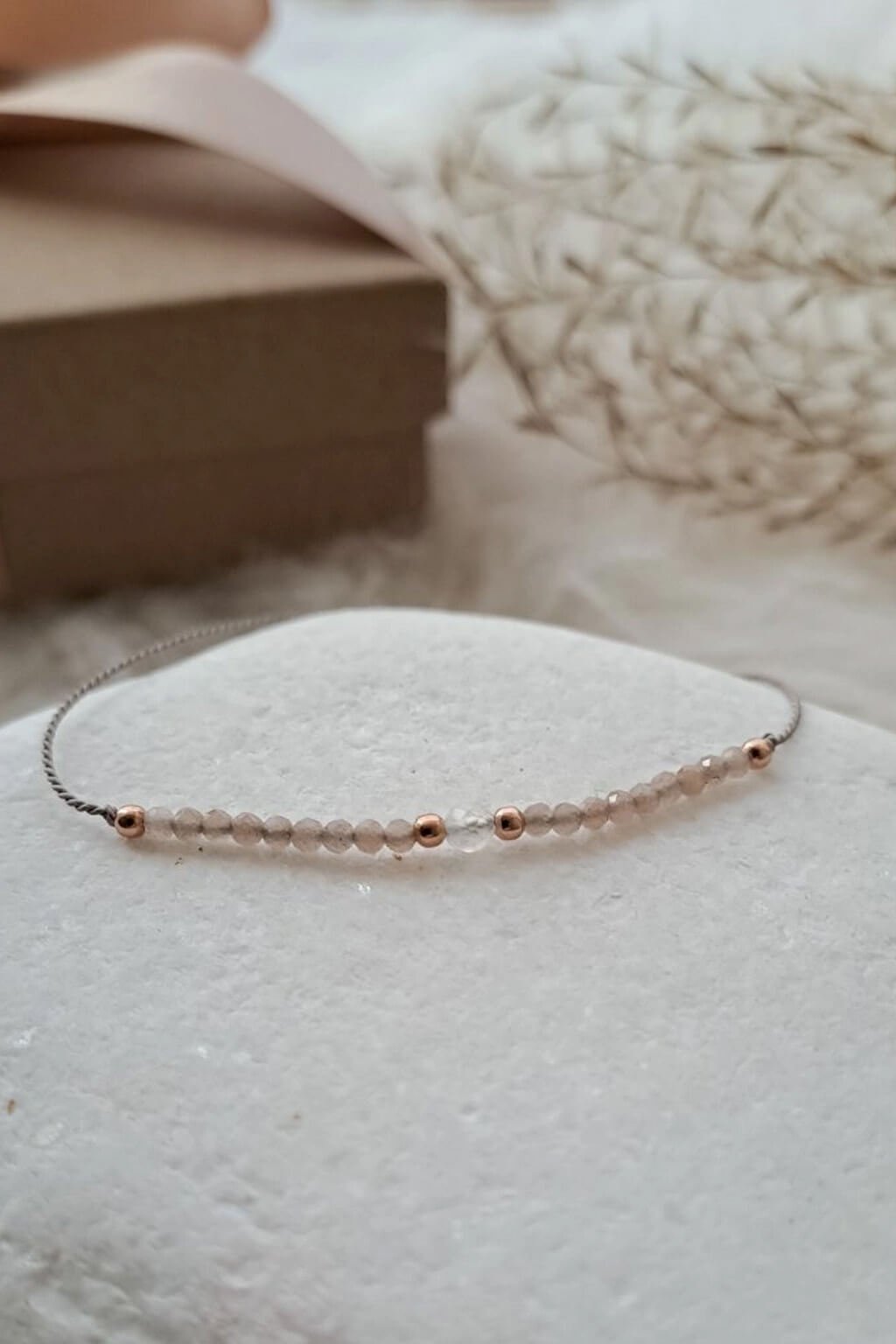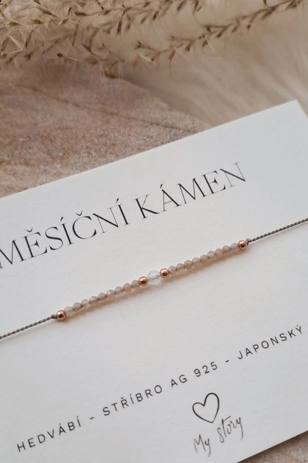 Romantický náramok z miniatúrnych fazetovaných korálikov mesačného kameňa - hnedého a "rainbow" na šedej šnúrke z hodvábu.
