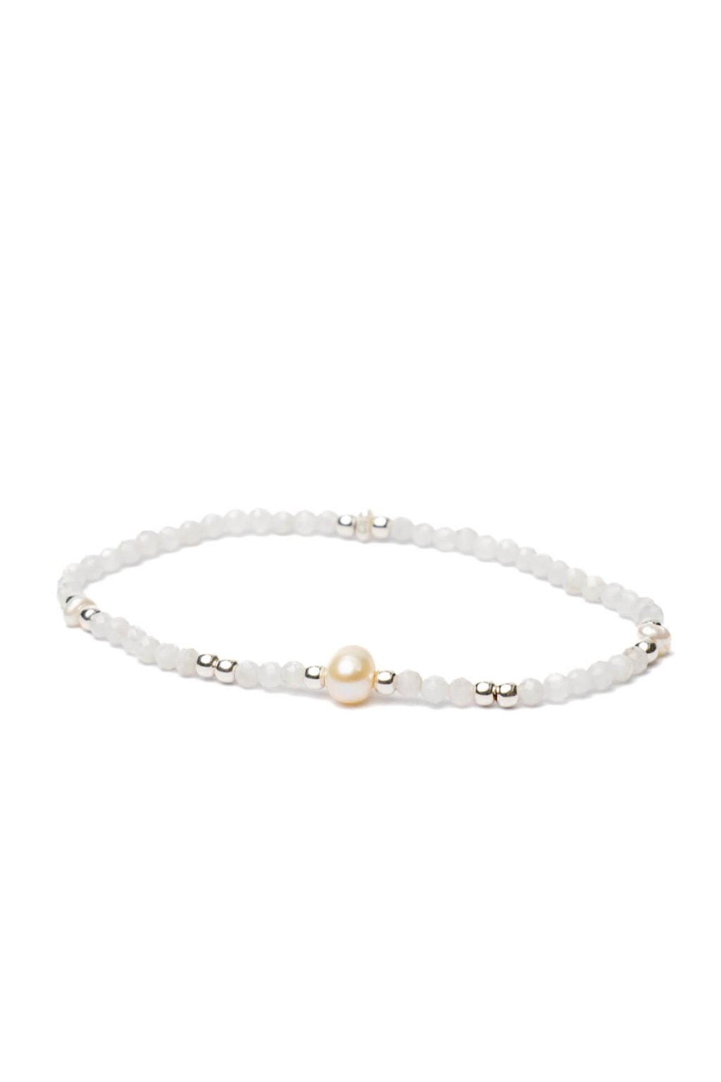 Náramok kombinujúci mesačný kameň a riečnu perlu so striebornými komponentmi predstavuje dokonalú harmóniu elegancie a čistoty.