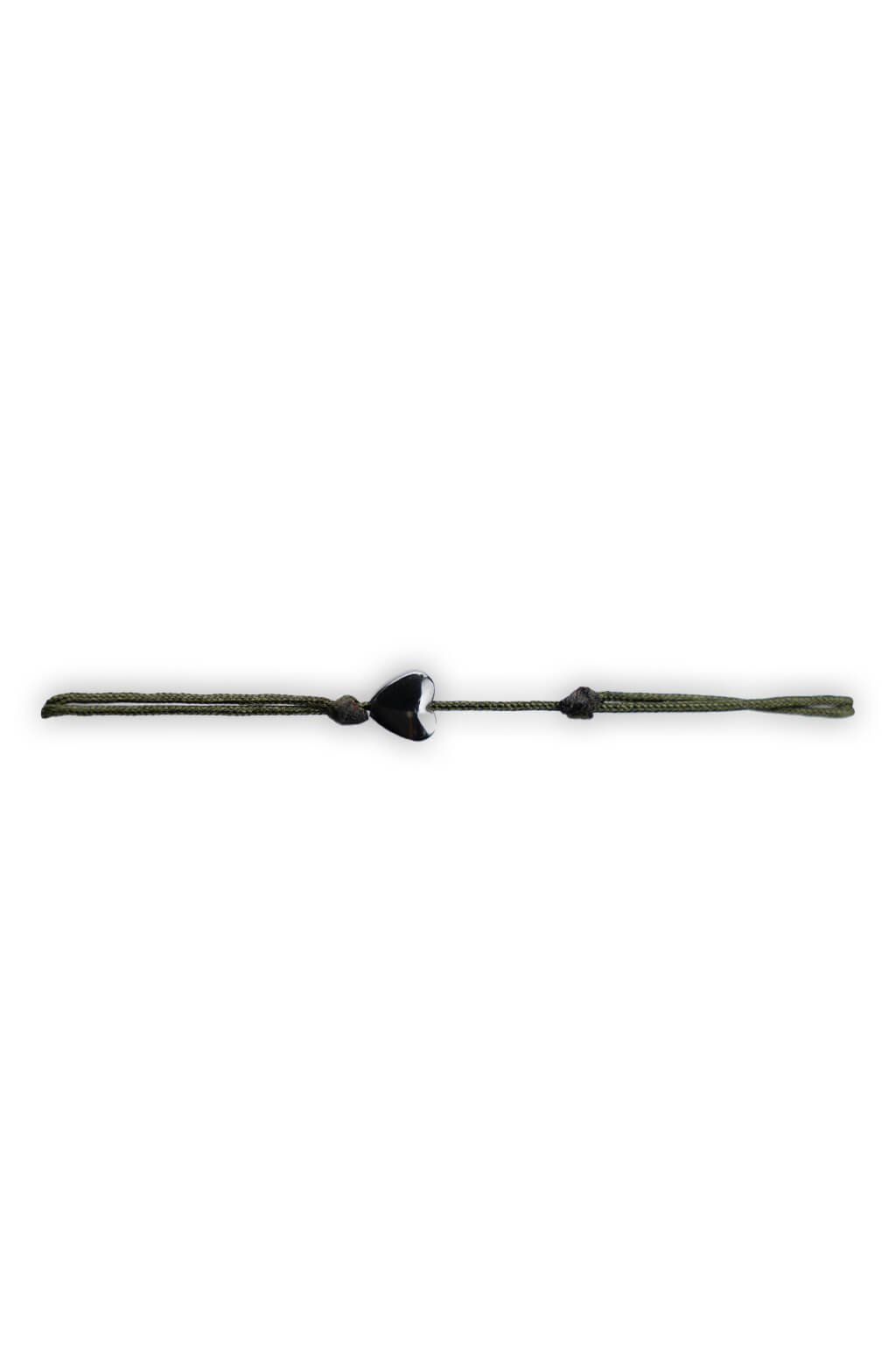 Decentný náramok s drobným hematitovým srdiečkom a tmavozelenou šnúrkou.