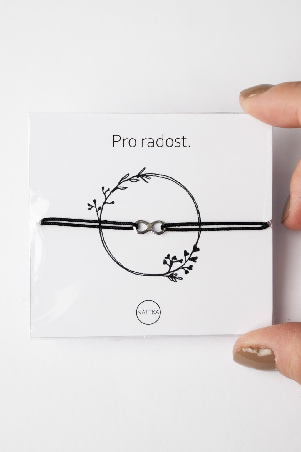 Decentný náramok s drobným nekonečnom a šnúrou čiernej farby.