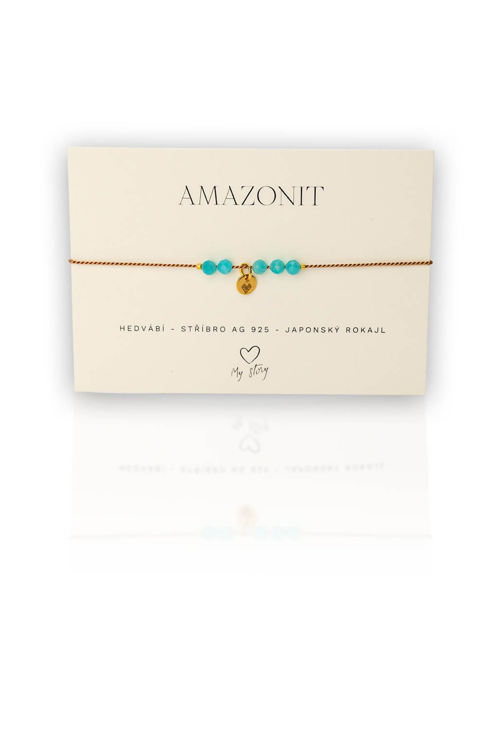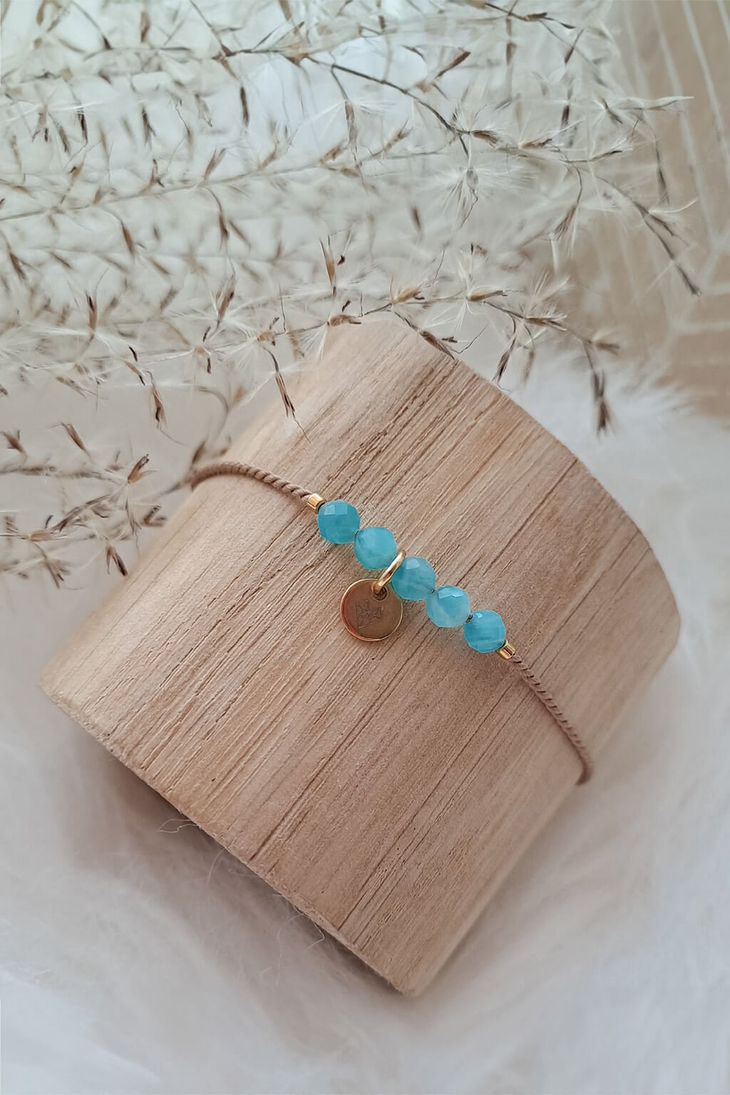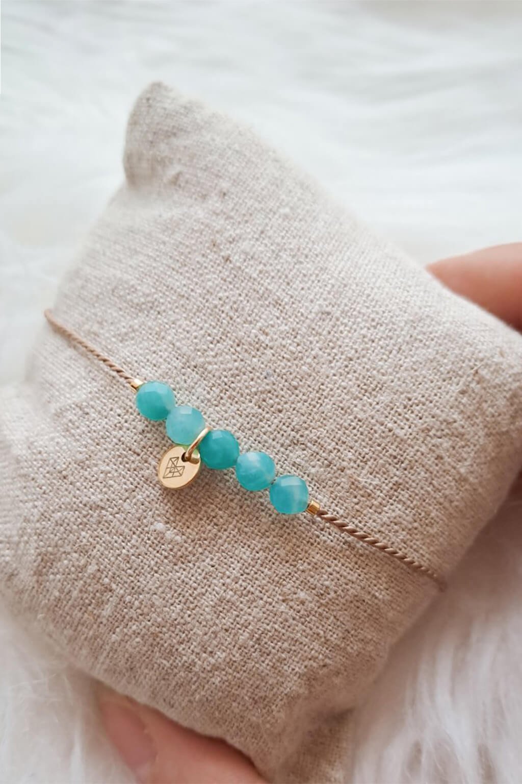 Náramok s Amazonitom a plackou je šperk, ktorý spája jemnosť a silnú symboliku. Tento náramok sa skladá z fazetovaných korálikov amazonitu doplnených plackou z chirurgickej ocele v zlatom odtieni, všetko na béžovej hodvábnej šnúrke.