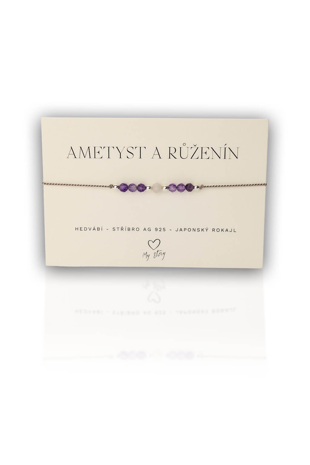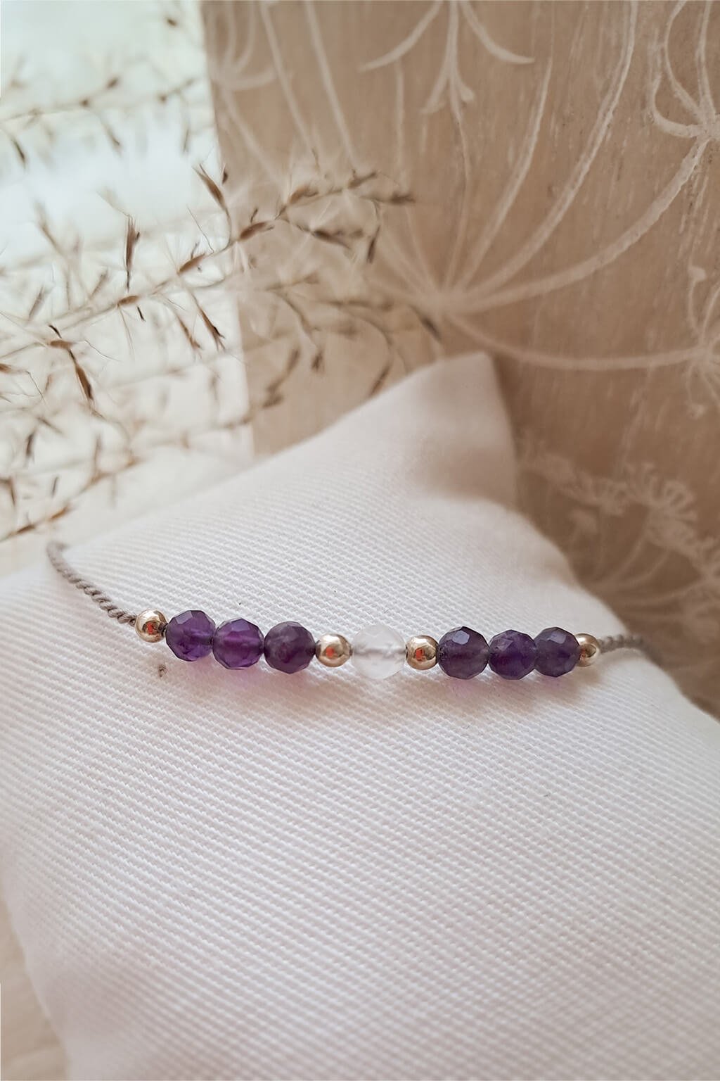 Tento náramok kombinuje krásu a liečivú silu ametystu a ruženínu na šedej hodvábnej šnúrke. Ametyst, tradične známy ako kameň čistoty a zbožnosti, ponúka ochranu a podporuje pokojný spánok, zatiaľ čo ruženín, kameň lásky, otvára srdce a podporuje sebalásku.