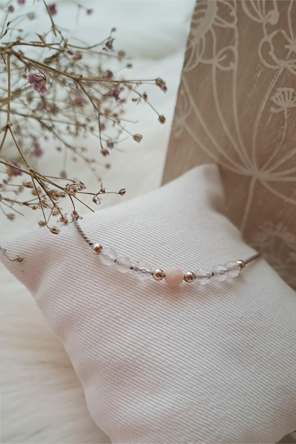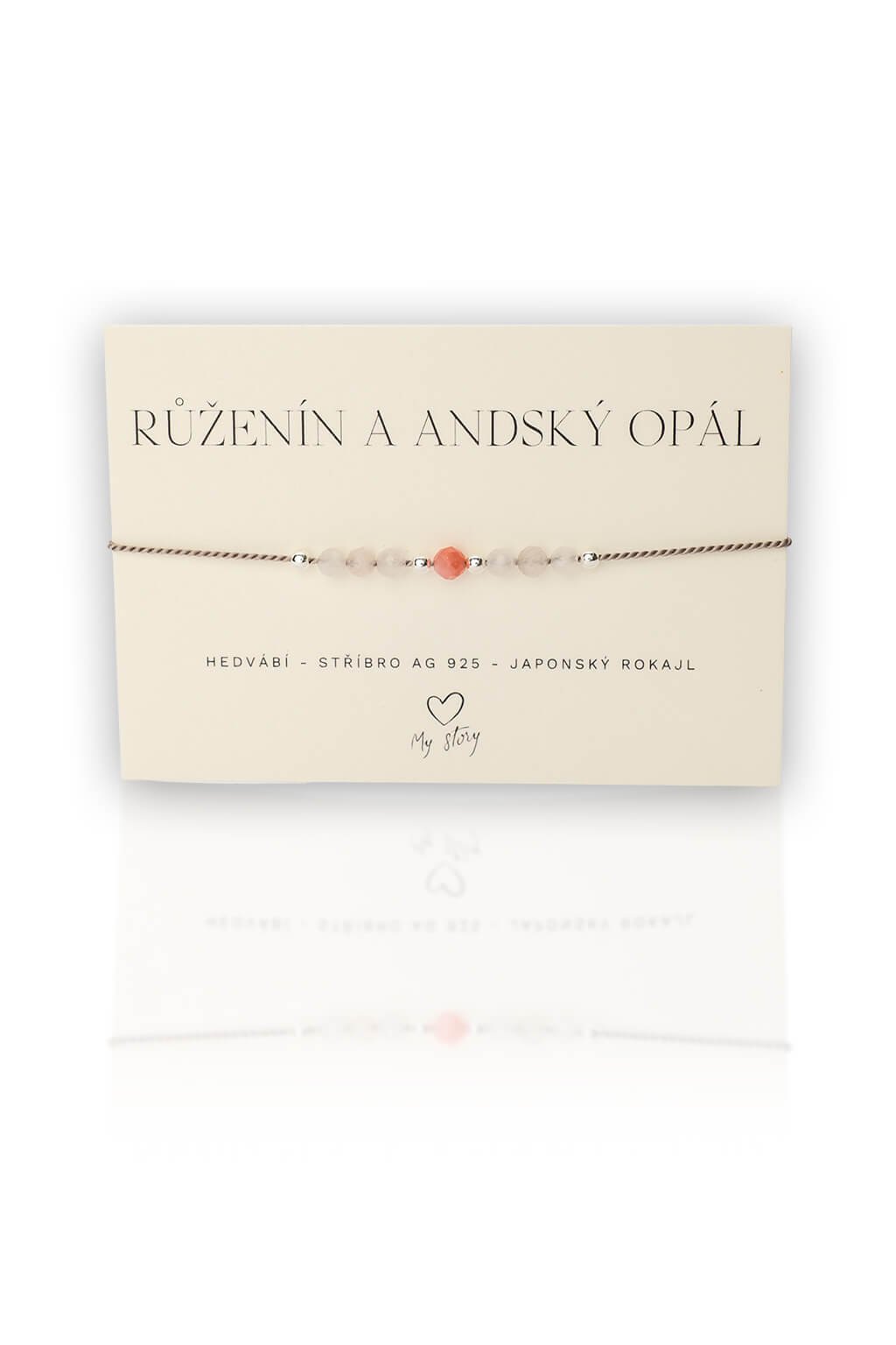 Náramok s Ruženínom a Andským Opálom je majstrovským dielom spájajúcim krásu a terapeutickú silu. Fazetované korálky ruženínu sú umiestnené na šedej hodvábnej šnúrke a sú obklopené striebornými korálkami Ag925.
