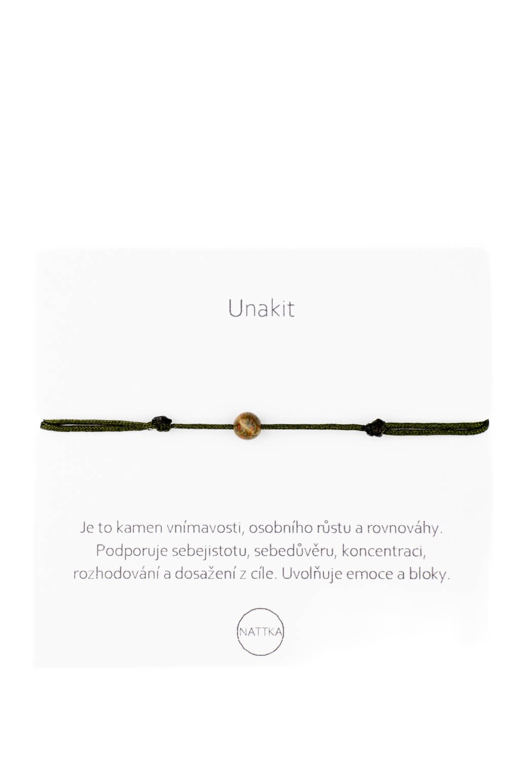 Decentný náramok s minerálom unakit a šnúrkou tmavozelenej farby.