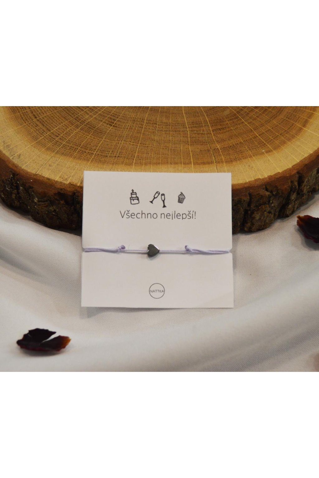 Šnúrkový náramok so srdiečkom z hematitu a kartičkou s prianím. Materiál: hematit, nylonová šnúrka.