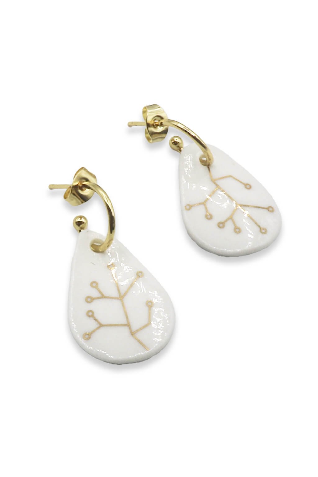 Porcelánové náušnice so zlatou kresbou vetvičiek. Náušnice sú na krúžkoch z chirurgickej ocele v zlatej farbe, ktorá je šetrná k citlivej pokožke.