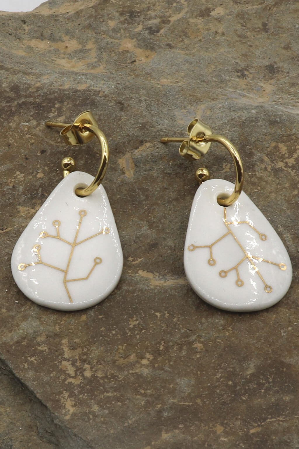Porcelánové náušnice so zlatým motívom vetvičiek sú upevnené na krúžkoch z chirurgickej ocele zlatej farby, čo je ideálna voľba pre citlivú pokožku.