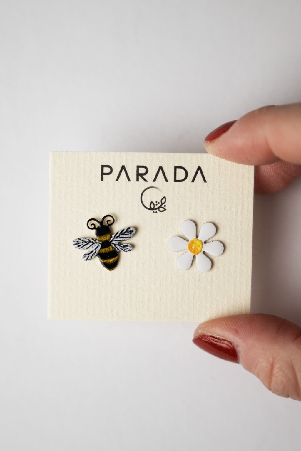 Krásne ručne maľované puzety s motívom včielky a margarétky sú zasadené do smaltovanej nehrdzavejúcej ocele. Ich jemný dizajn je ľahký a pohodlný, ideálny na každodenné nosenie. Puzeta je pevne pripevnená k základni pre trvalé spojenie a súčasťou sú zapínacie špuntíky.