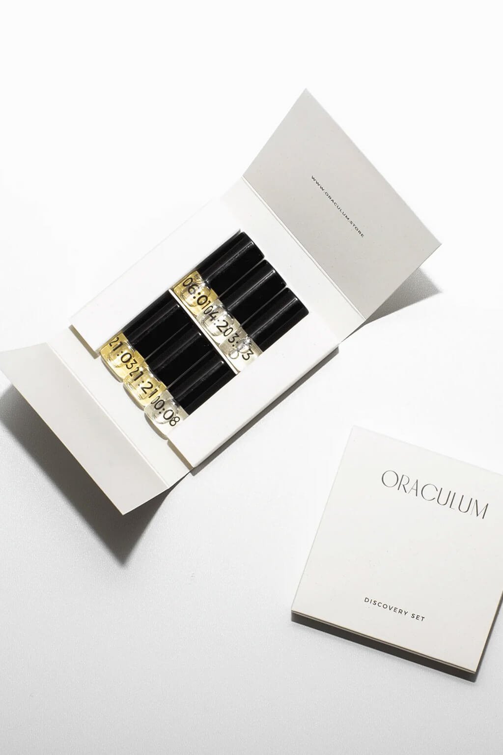 Objavte svet parfumov ORACULUM ukrytý v jednej elegantnej krabičke. Táto sada obsahuje 1 ml vzorky olejových parfumov Cottonist, Confidist, Sensualist, Royalist, Principist a Hedonist, z ktorých každý čerpá inšpiráciu z rôznych životných momentov. Každá vôňa je tak originálnym prekvapením. Zbúrajte zaužívané predstavy a otvorte sa novým možnostiam sebavyjadrenia cez vrstvenie vôní a vytvorenie svojej vlastnej jedinečnej kombinácie.