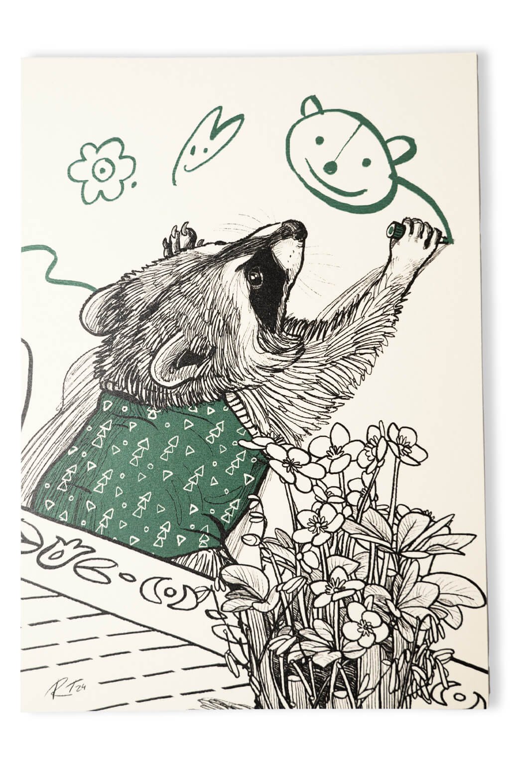 Roztomilý mýval umelec so zeleným detailom. Obrázky od značky Z lásky k spomienkam sú ideálne pre didaktický rozvoj detí, ľahko zaujmú a podnietia túžbu bábätka objavovať a skúmať, a to už od dvoch týždňov veku. Mývalie alebo vydrie obrázky vo formáte A5 môžete umiestniť do detskej izby alebo malého kútika vo vašej spálni, k postieľke či prebaľovaciemu pultu – jednoducho kamkoľvek, kde budú v dosahu pohľadu. Týmto spôsobom poskytnete vášmu bábätku optimálne podnety pre rozvoj zraku a inteligencie.
