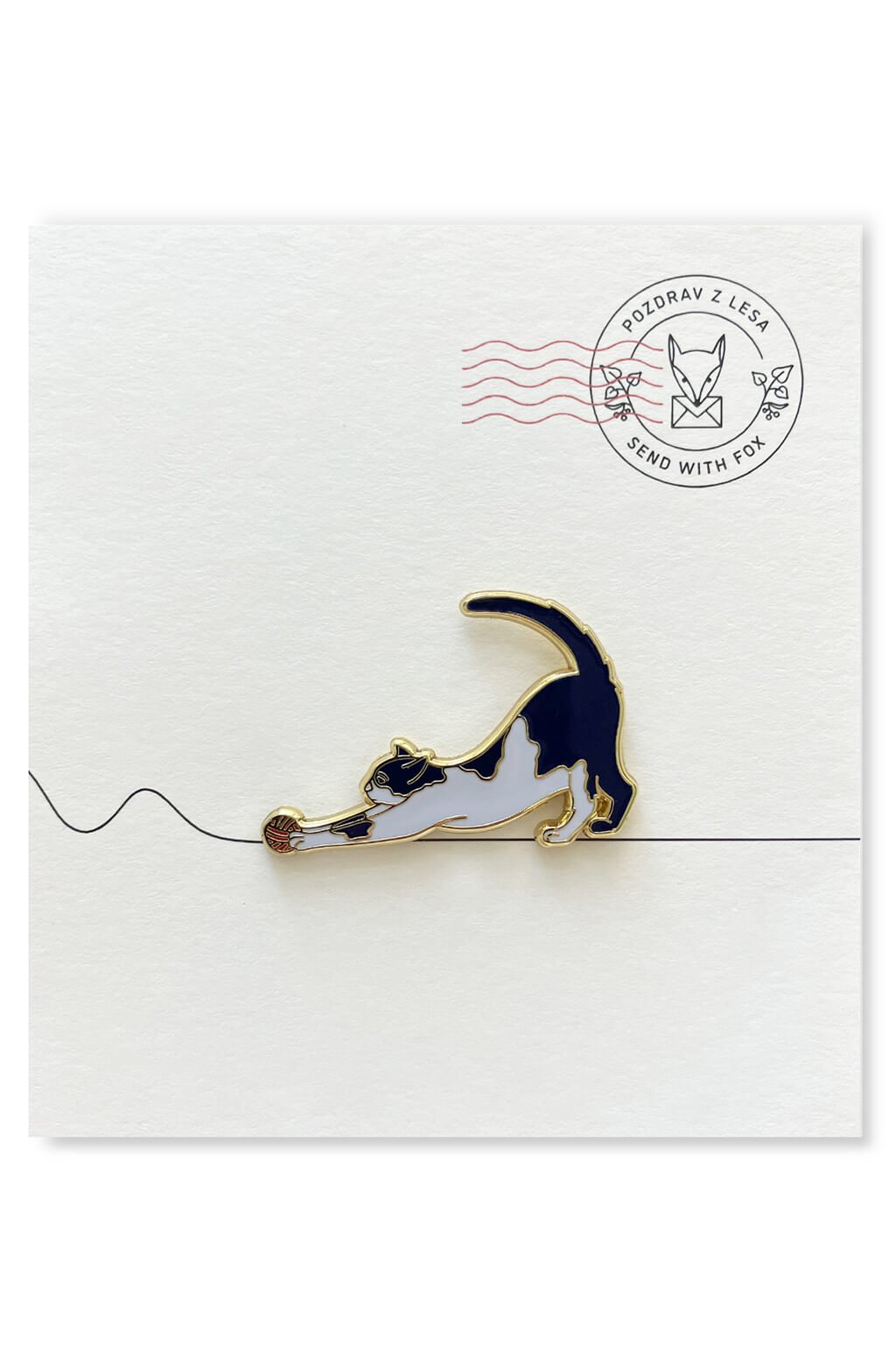 Odznak zo smaltovanej mosadze s hravou mačkou s čiernymi škvrnami a klbkom.
