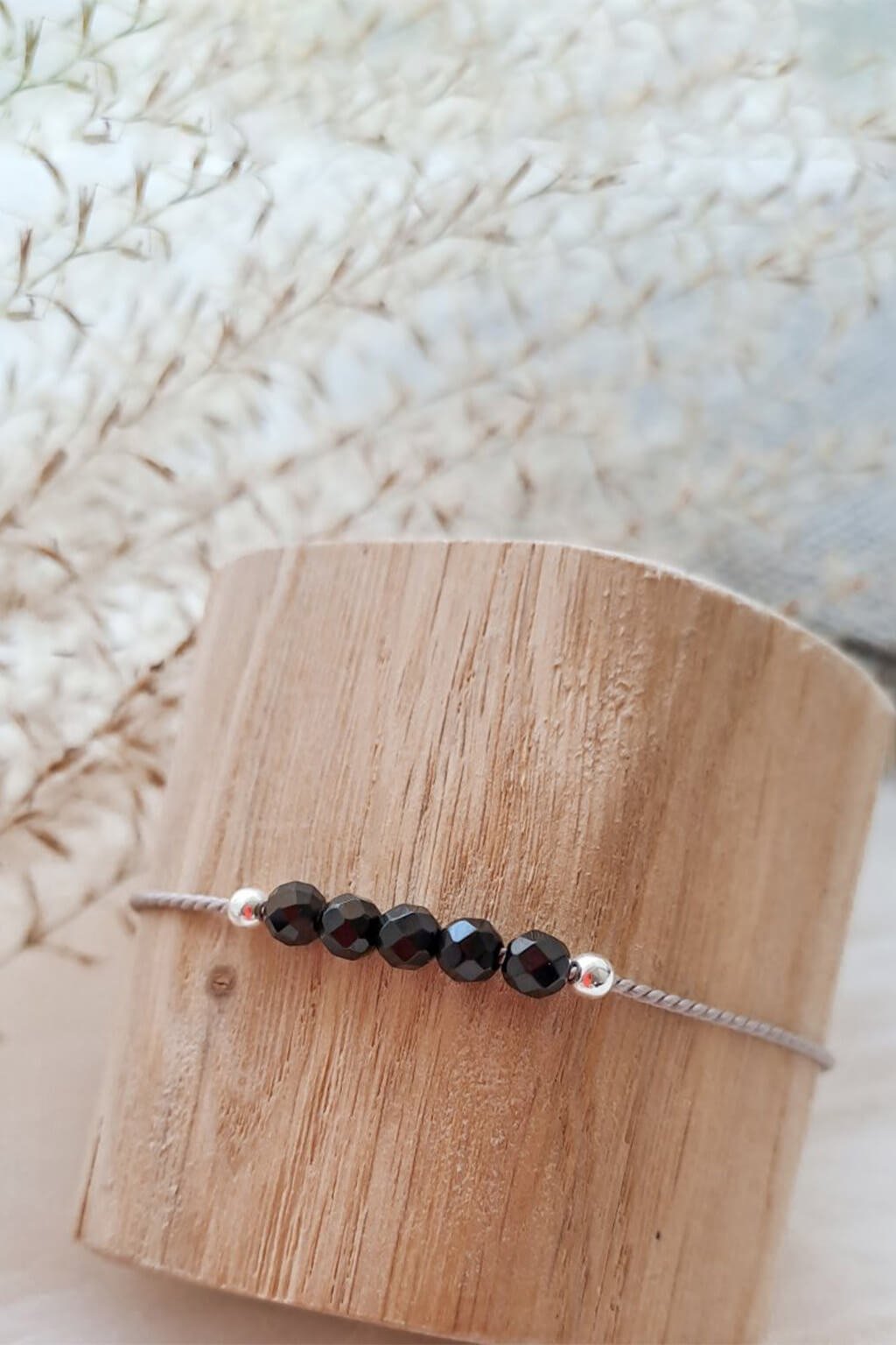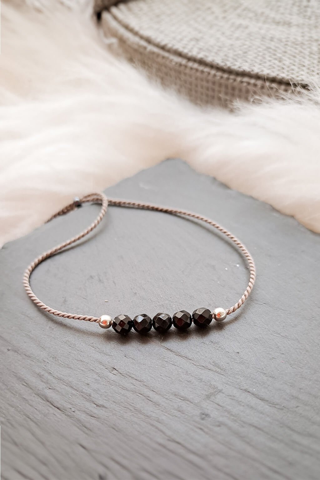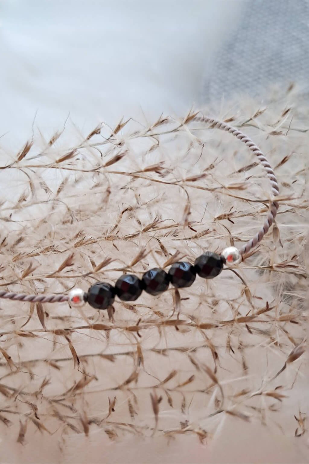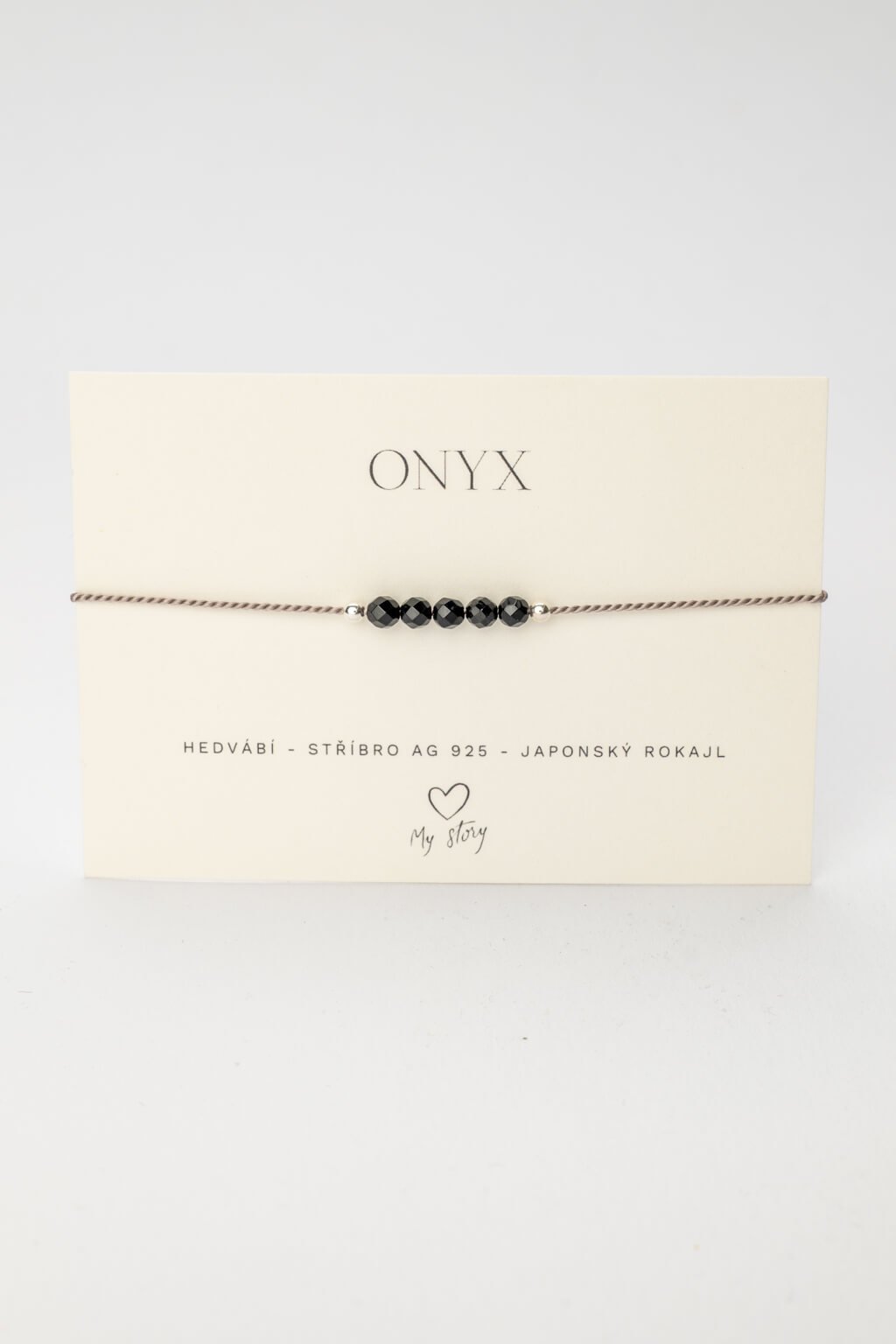 Náramok Onyx je elegantný a zároveň silný ochranný šperk. Tento náramok obsahuje fazetované guličky onyxu na šedej hodvábnej šnúrke, doplnené korálkami zo striebra Ag925. Čierny onyx, známy pre svoje ochranné vlastnosti, vytvára štít nad mysľou a telom, chráni pred negatívnou energiou a pomáha prekonávať strach. Je ideálny na nosenie v ťažkých obdobiach, pretože vyháňa smútok a zvyšuje sebavedomie a sebaovládanie.