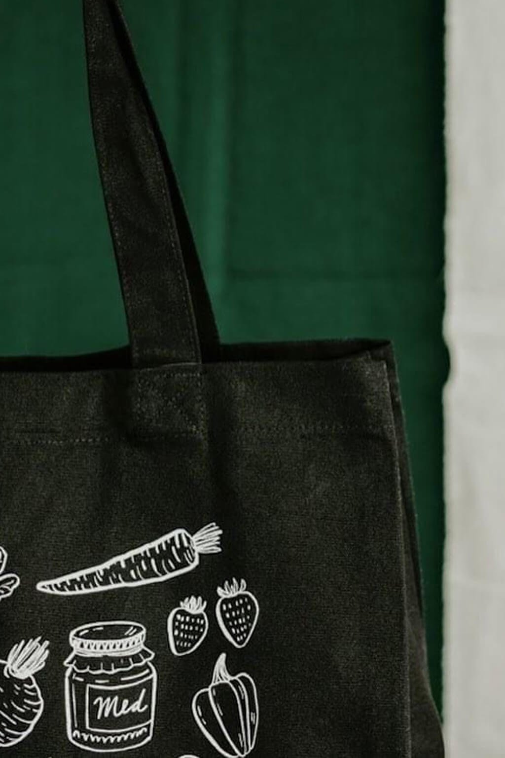 Štýlová čierna plátenná taška s bielou potlačou surovín, ako sú brokolica, reďkovky, chlieb, med, maslo alebo paradajky, sa stane skvelým doplnkom pre každodenné nákupy.
