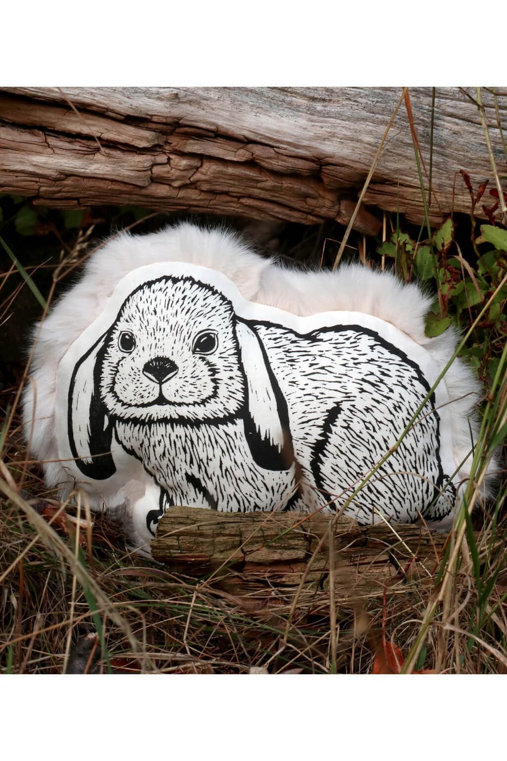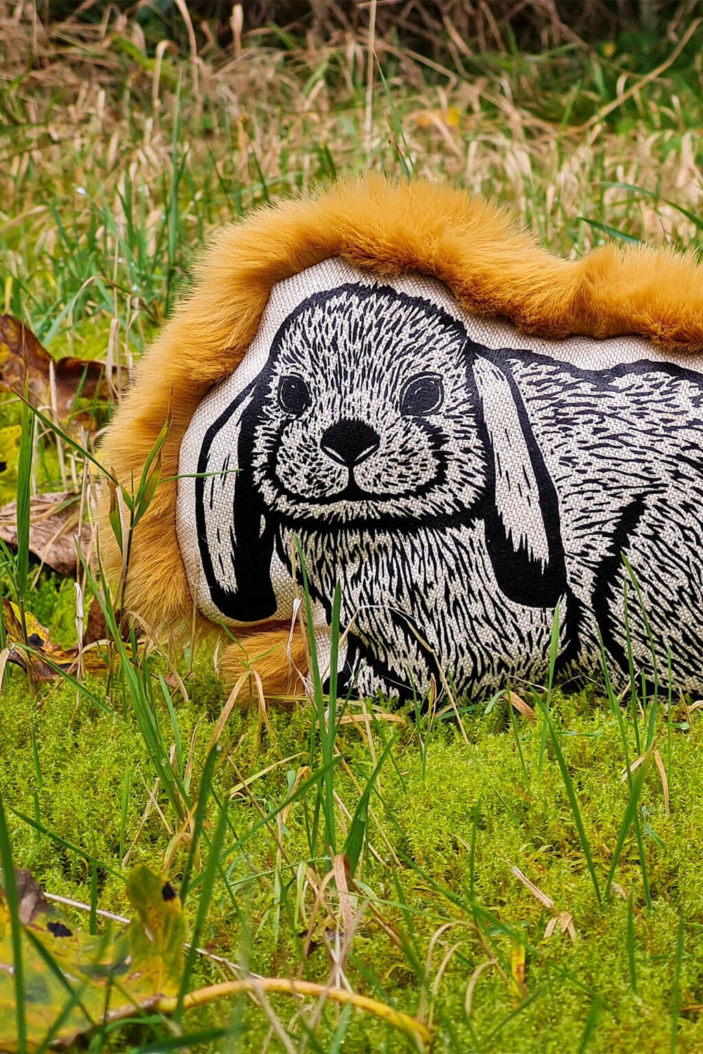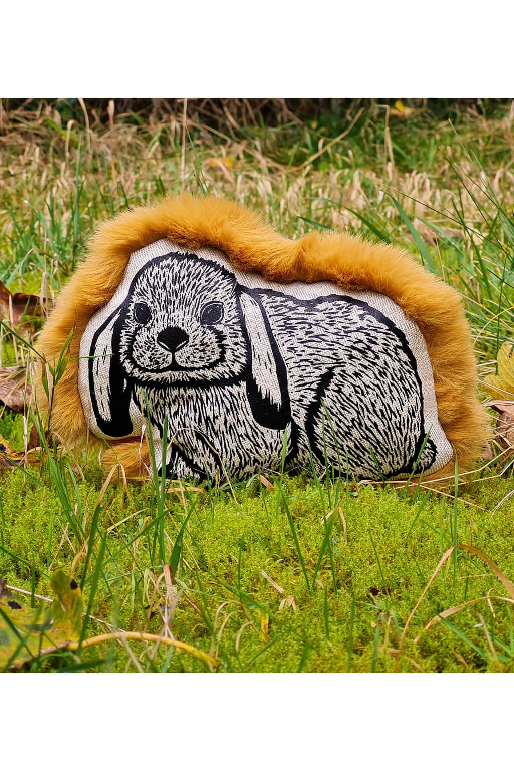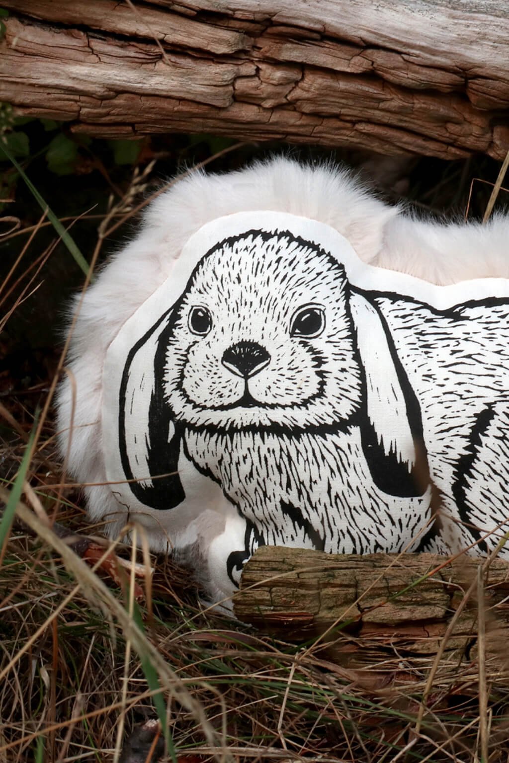 Jeho predná strana je zdobená autorským linorytom, ručne natišteným sieťotlačou, čo každému kúsku dáva jedinečný a čarovný vzhľad, zatiaľ čo zadná strana je pokrytá hebkým plyšom, ktorý pripomína jemnú srsť skutočného zajačika.