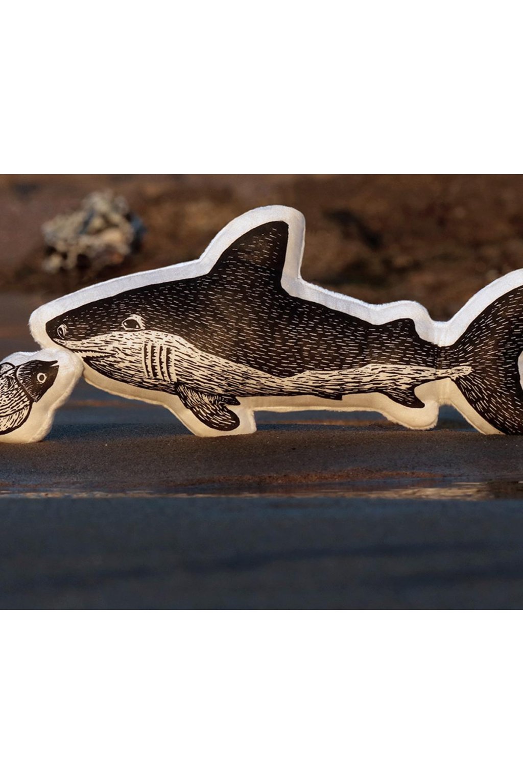 Žralok s rybkou je dvojica mäkkých plyšákov, ktorí sú prepojení magnetmi. Z prednej strany je autorský linoryt natlačený sieťotlačou a z druhej jemný plyš.