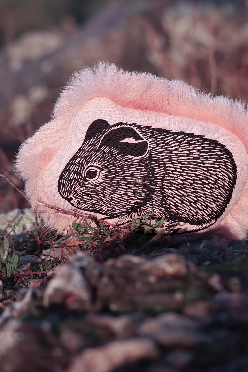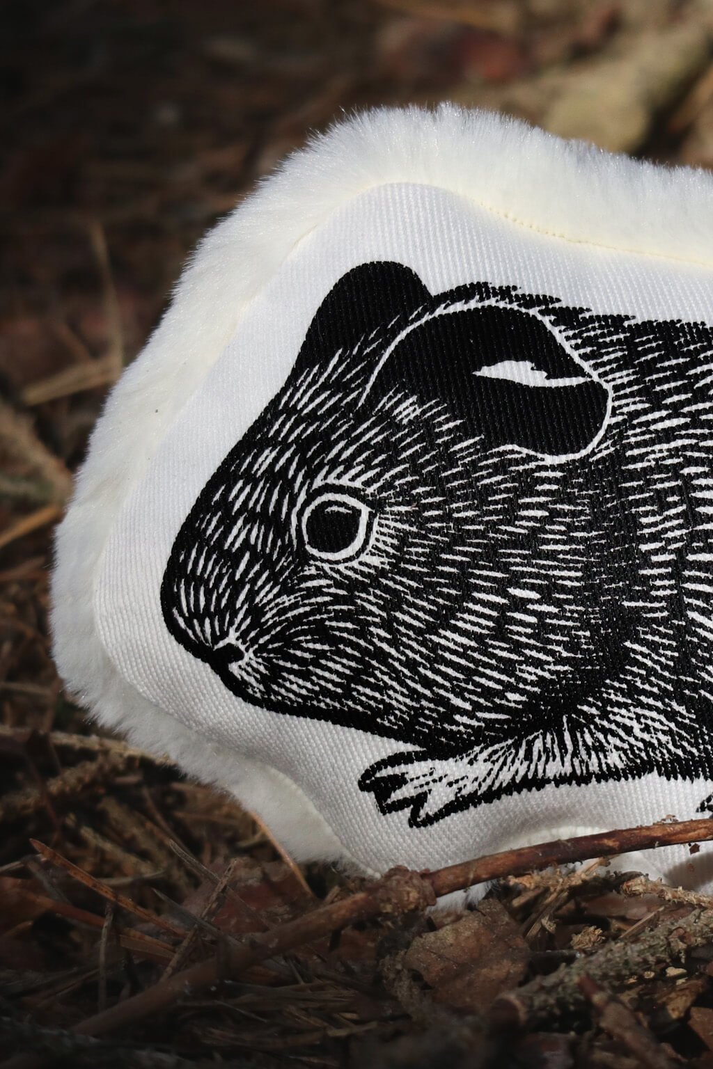 Jeho predná strana zdobená autorským linorytom, ručne natlačený sieťotlačou, pridáva každému kúsku unikátny a umelecký vzhľad, zatiaľ čo zadná strana je pokrytá hebkým plyšom, ktorý pripomína jemnú srsť morčaťa.