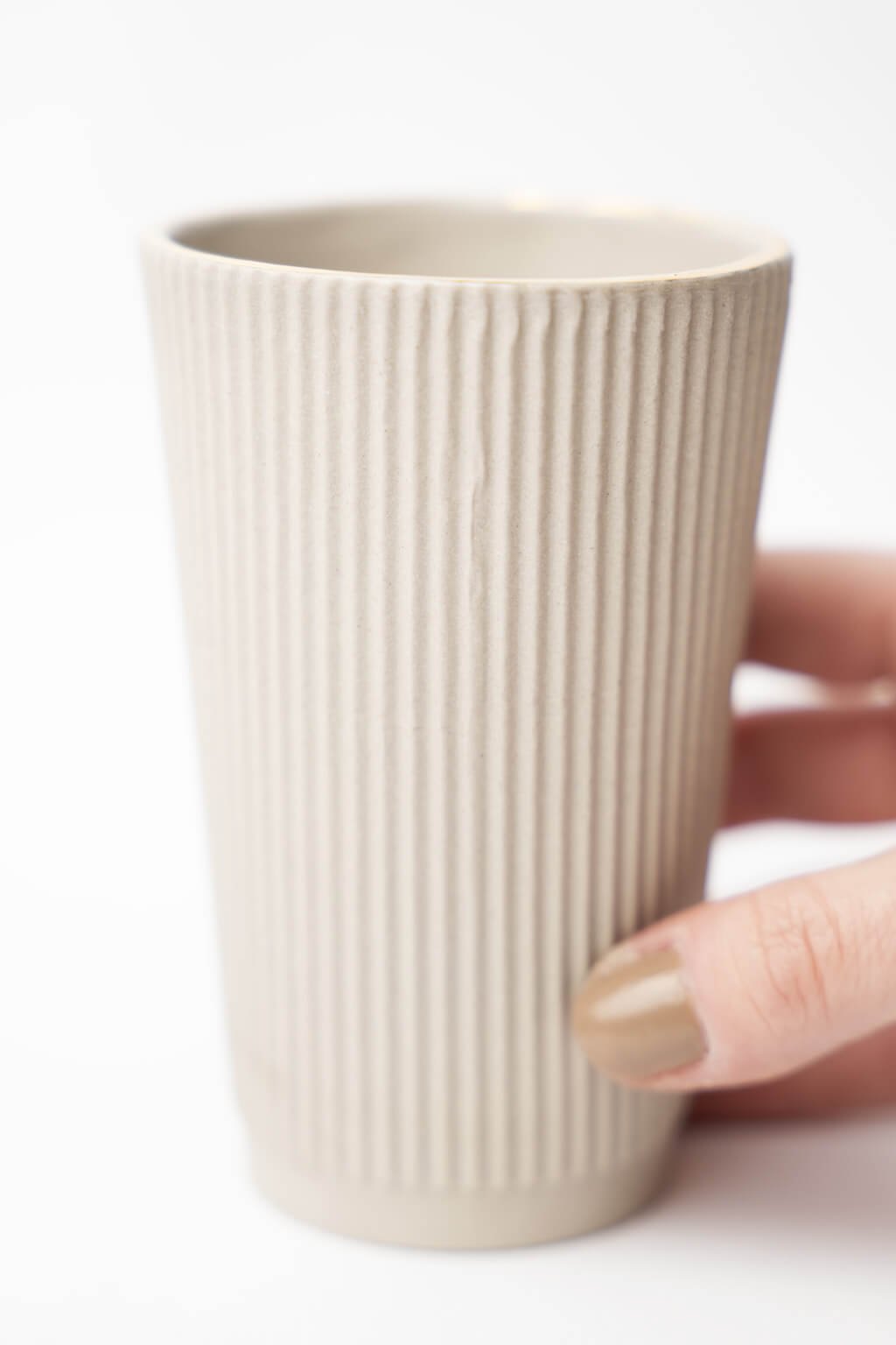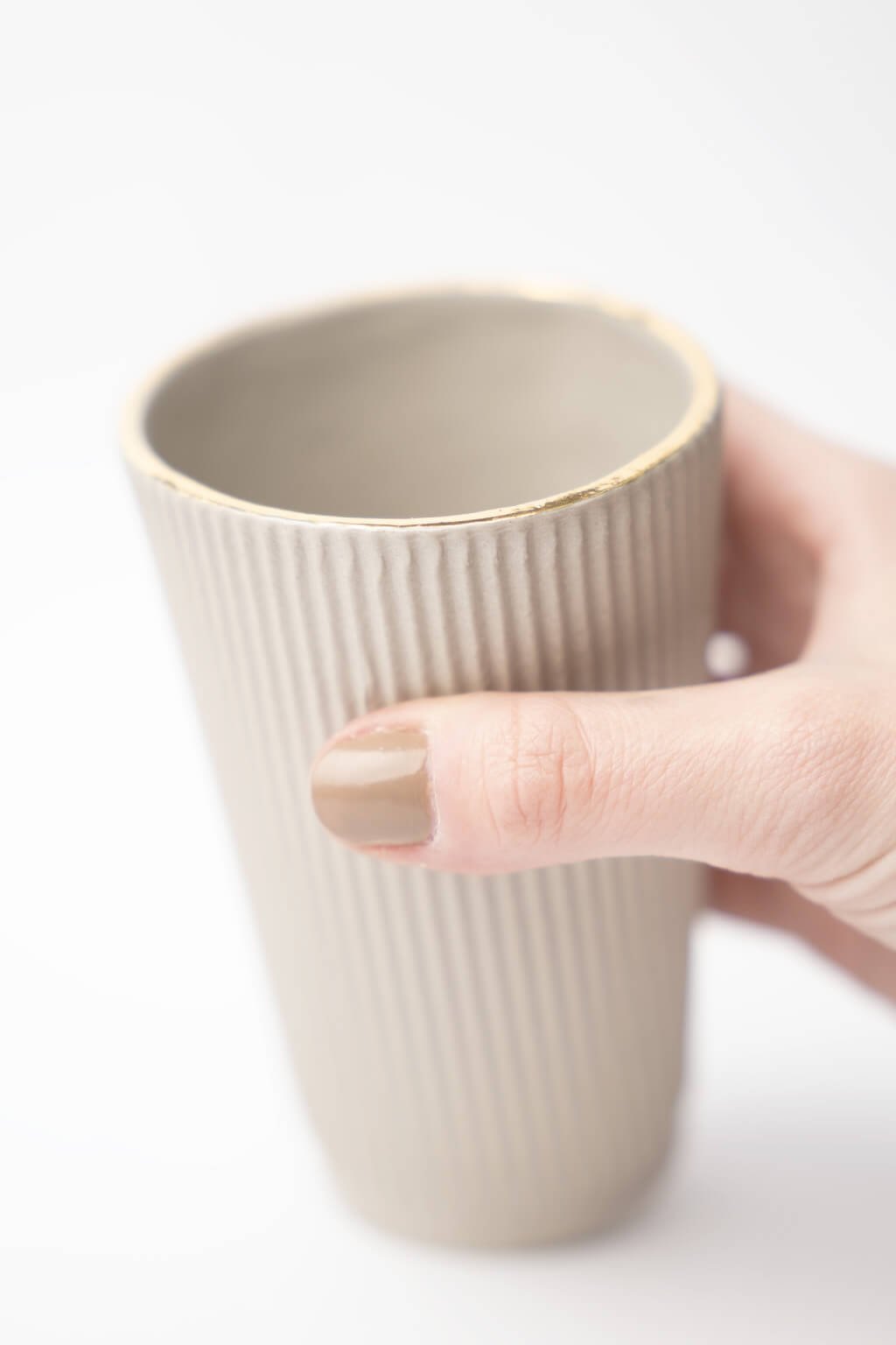 Keramický pohár s prírodne zemitou matnou glazúrou a jedinečnou vrúbkovanou textúrou prináša do každého dňa dotyk originality a vkusu. Zlatá linka na okraji pohára je dokonale luxusnou čerešničkou. Lesklý vnútro hrnčeka pôsobí luxusne a umožňuje ľahké umývanie. Hrnček je vyrobený z kvalitnej keramiky, čo zaručuje príjemný pocit pri držaní a dlhú životnosť.