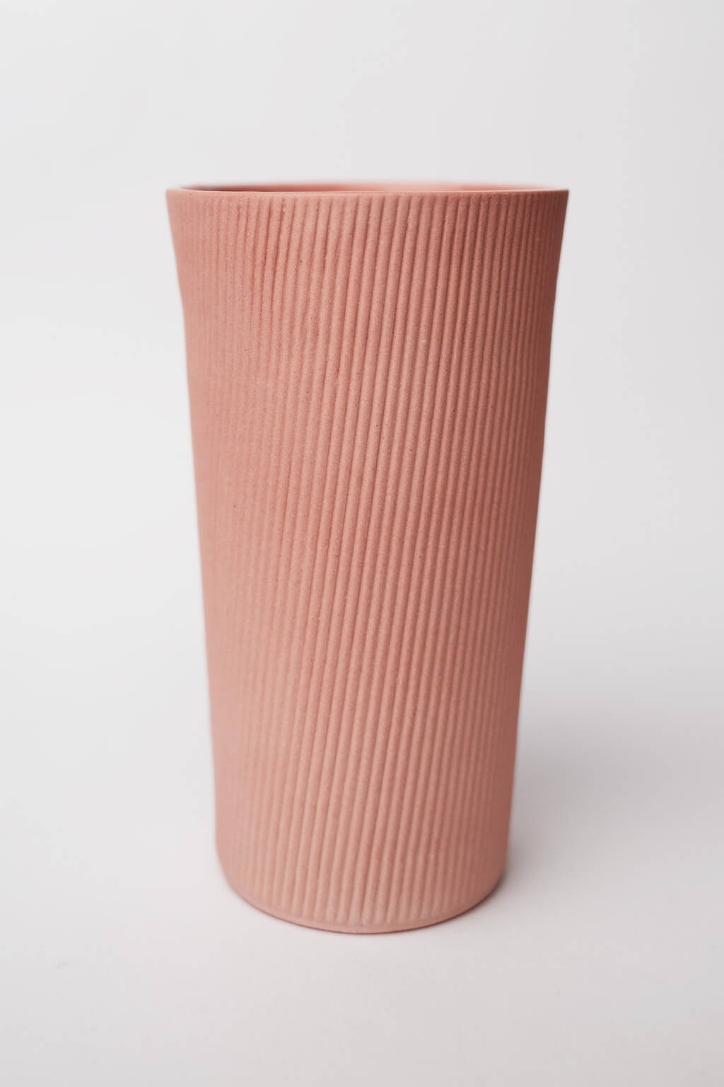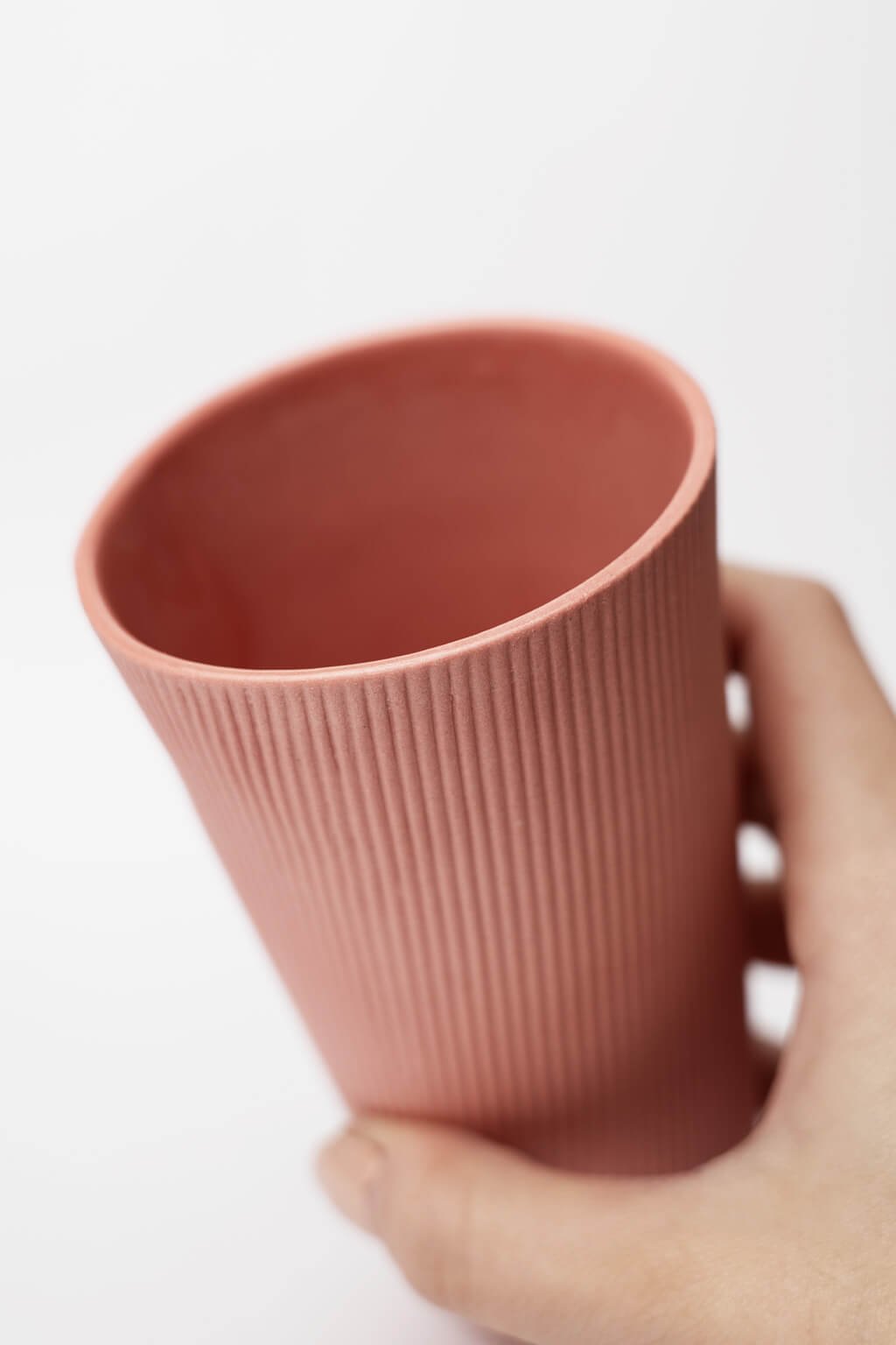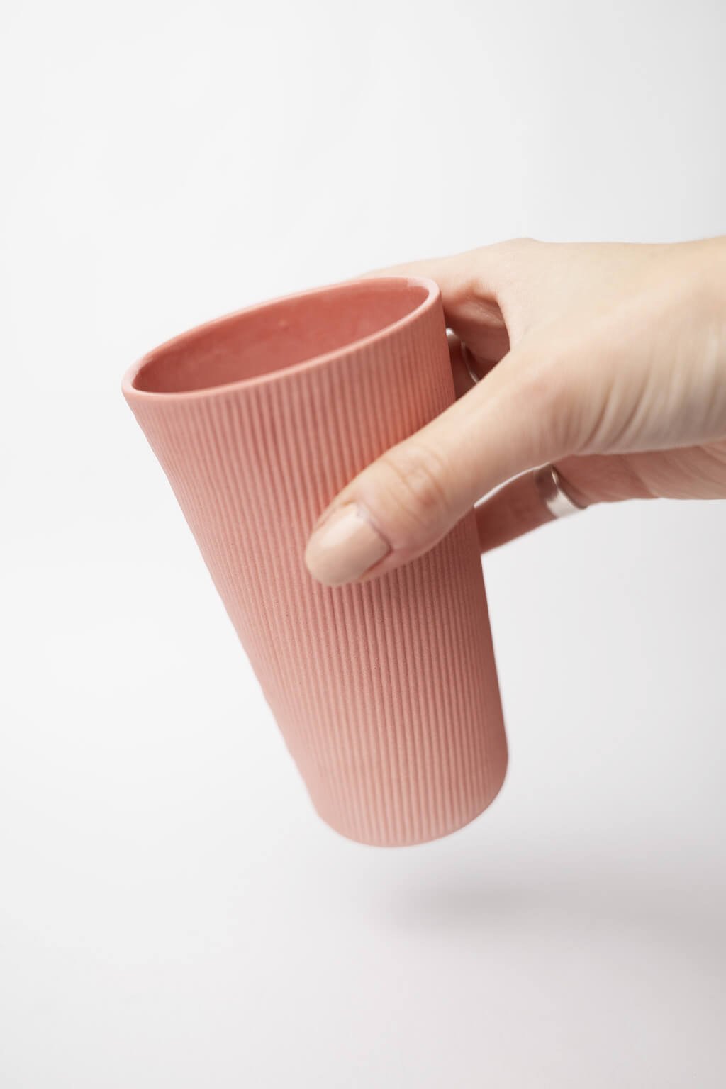 Keramický pohár s jemnou matnou ružovou glazúrou a jedinečnou vrúbkovanou textúrou prináša do každého dňa dotyk originality a vkusu. Lesklý vnútro hrnčeka pôsobí luxusne a umožňuje jednoduché umývanie. Hrnček je vyrobený z kvalitnej keramiky, čo zaručuje príjemný pocit pri držaní a dlhú životnosť.