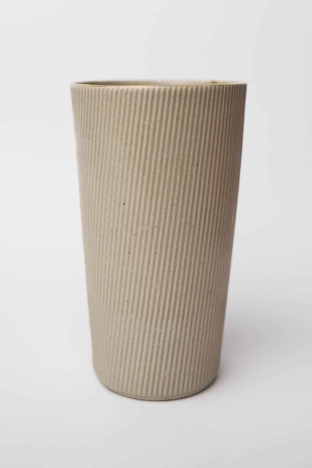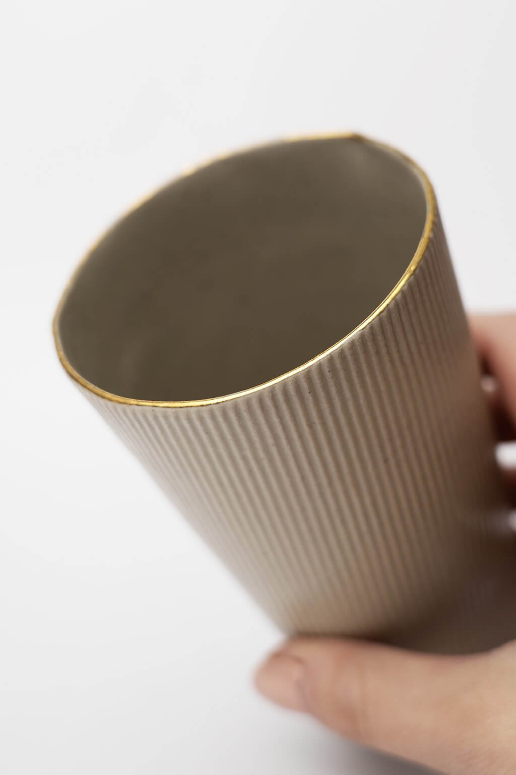 Keramický pohár s prírodne zemitou matnou glazúrou a jedinečnou vrúbkovanou textúrou prináša do každého dňa dotyk originality a vkusu. Zlatá linka na okraji pohára je dokonale luxusnou čerešničkou. Lesklý vnútro hrnčeka pôsobí luxusne a umožňuje jednoduché umývanie. Hrnček je vyrobený z kvalitnej keramiky, čo zaručuje príjemný pocit pri držaní a dlhú životnosť.