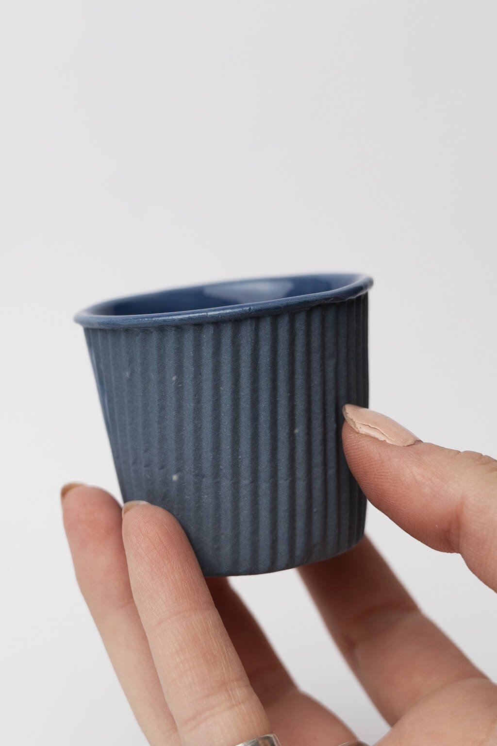 Keramický kalíšok na espresso v matnej modrej glazúre s jemne vrúbkovaným povrchom od značky Moo Ceramics.
