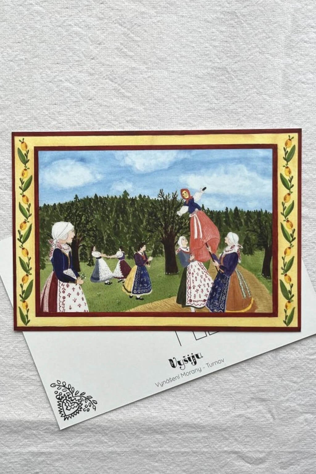 Autorská pohľadnica s ilustráciou vynášania Morany od značky Vyšiju.