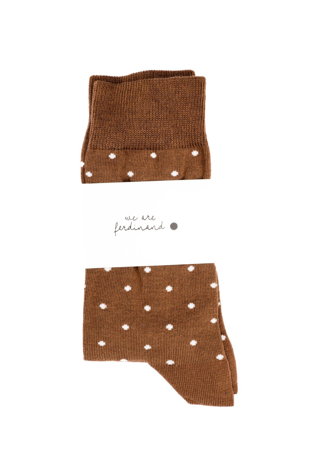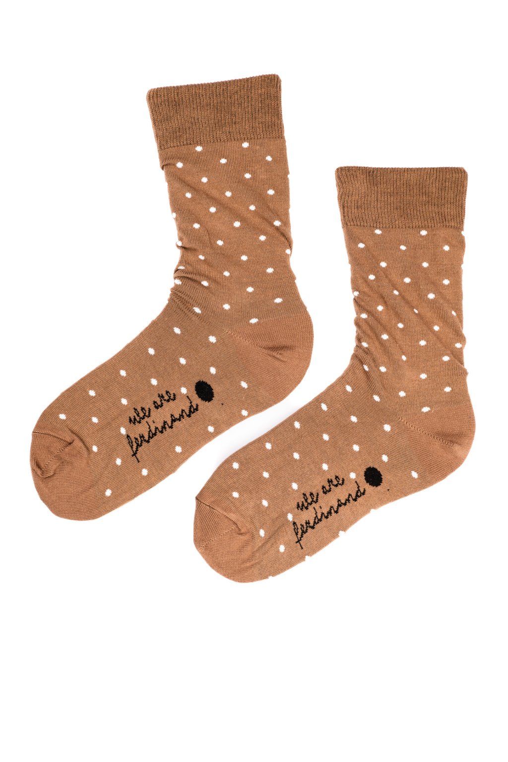 Hnedá farba evokuje prírodné tóny a pripomína pohodu. Je to farba stability, spojenia so zemou a prírodného prostredia. Biele bodky na ponožkách dodávajú do dizajnu hravosť a vzdušnosť. Táto kombinácia farieb vytvára pútavý kontrast a priťahuje pozornosť k vašim nohám.