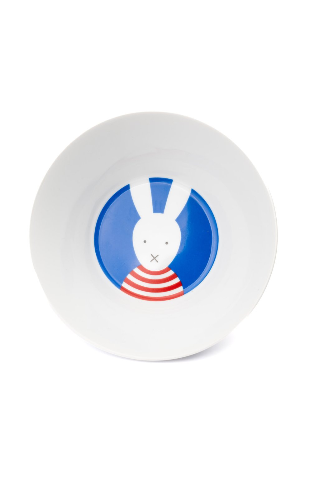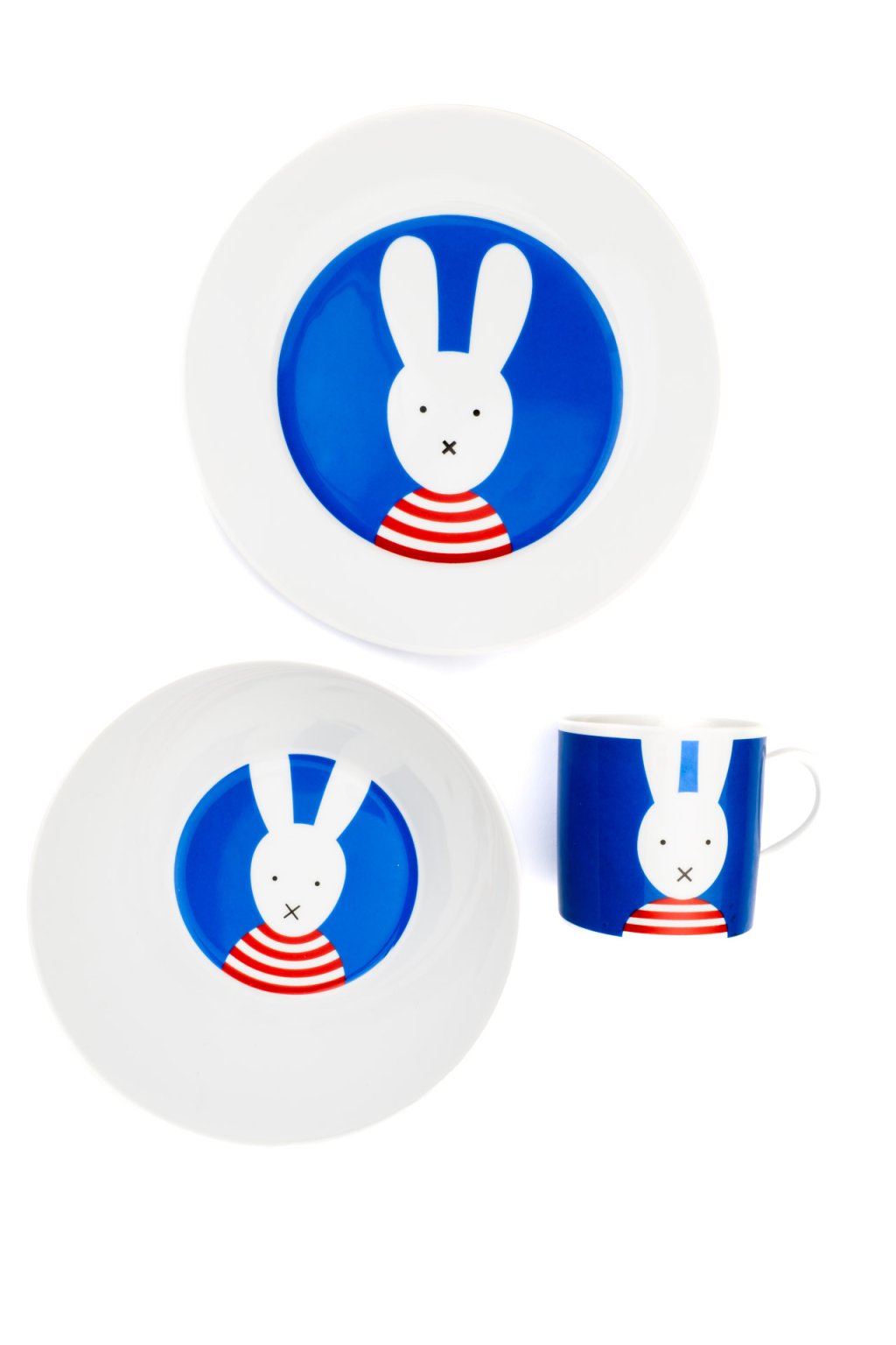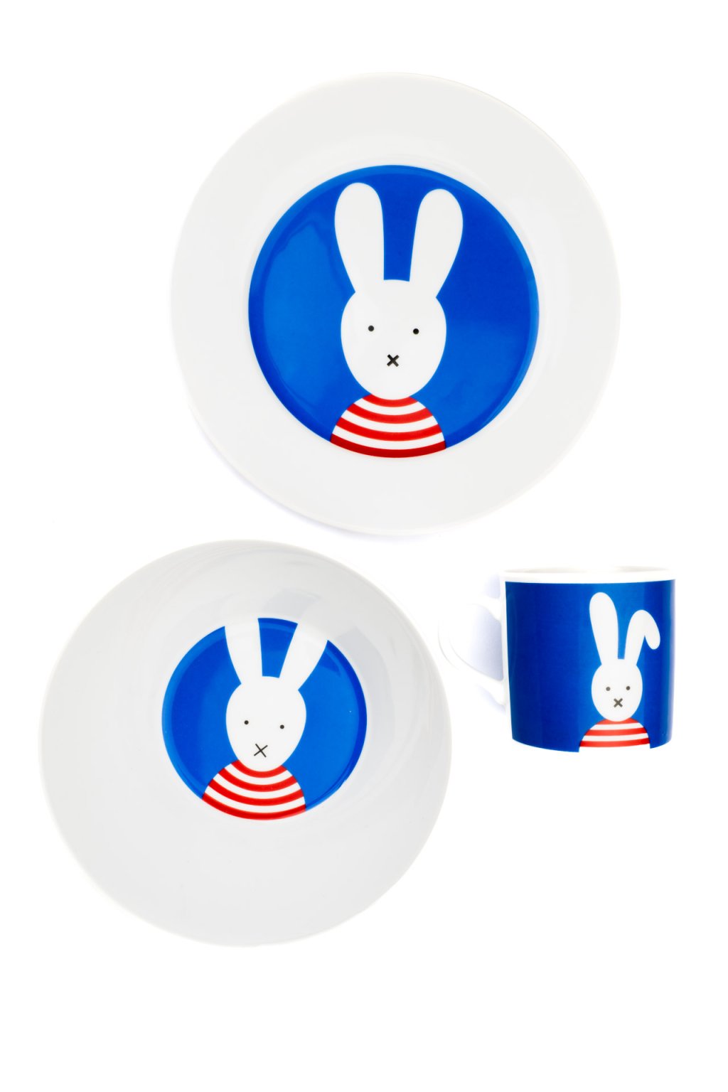 Porcelánový set od značky HANDLE WITH CARE obsahuje hrnček, tanier a misku. Na dne misky a tanierika, po dojedení jedla, číha ilustrácia králika od Jana Laštovičku.