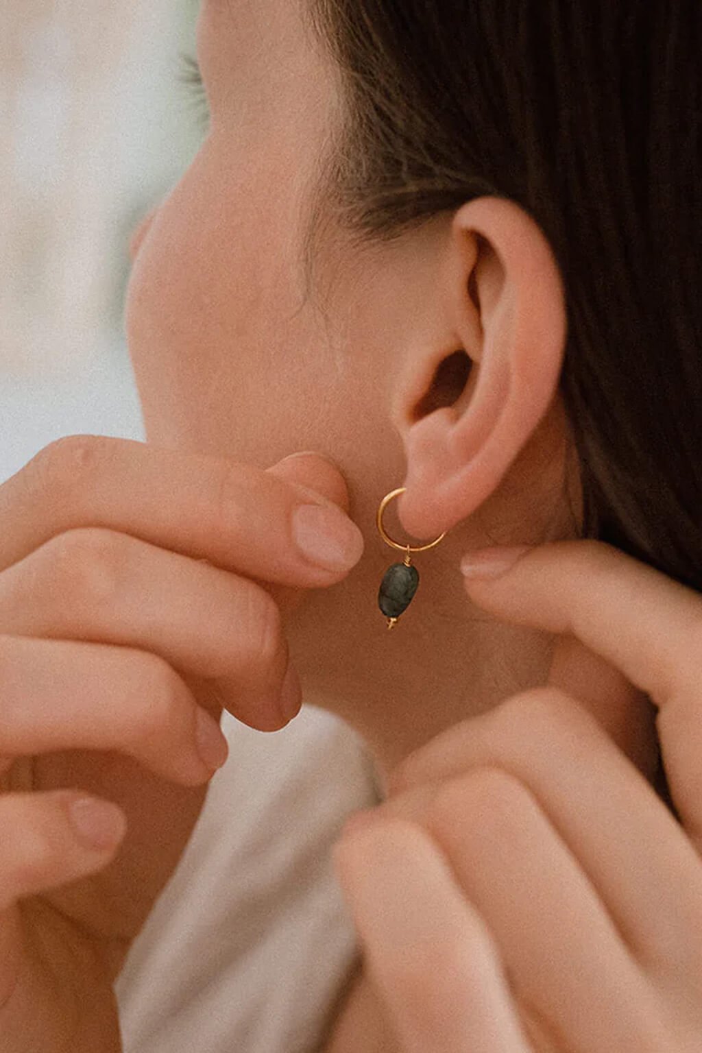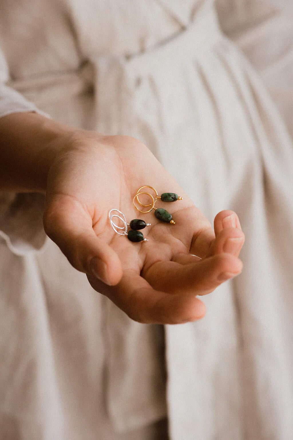 Originálne žensky nežné pozlátené náušnice so smaragdom rozžiaria každý váš deň. Doprajte si výnimočný šperk od značky Bohovibes.