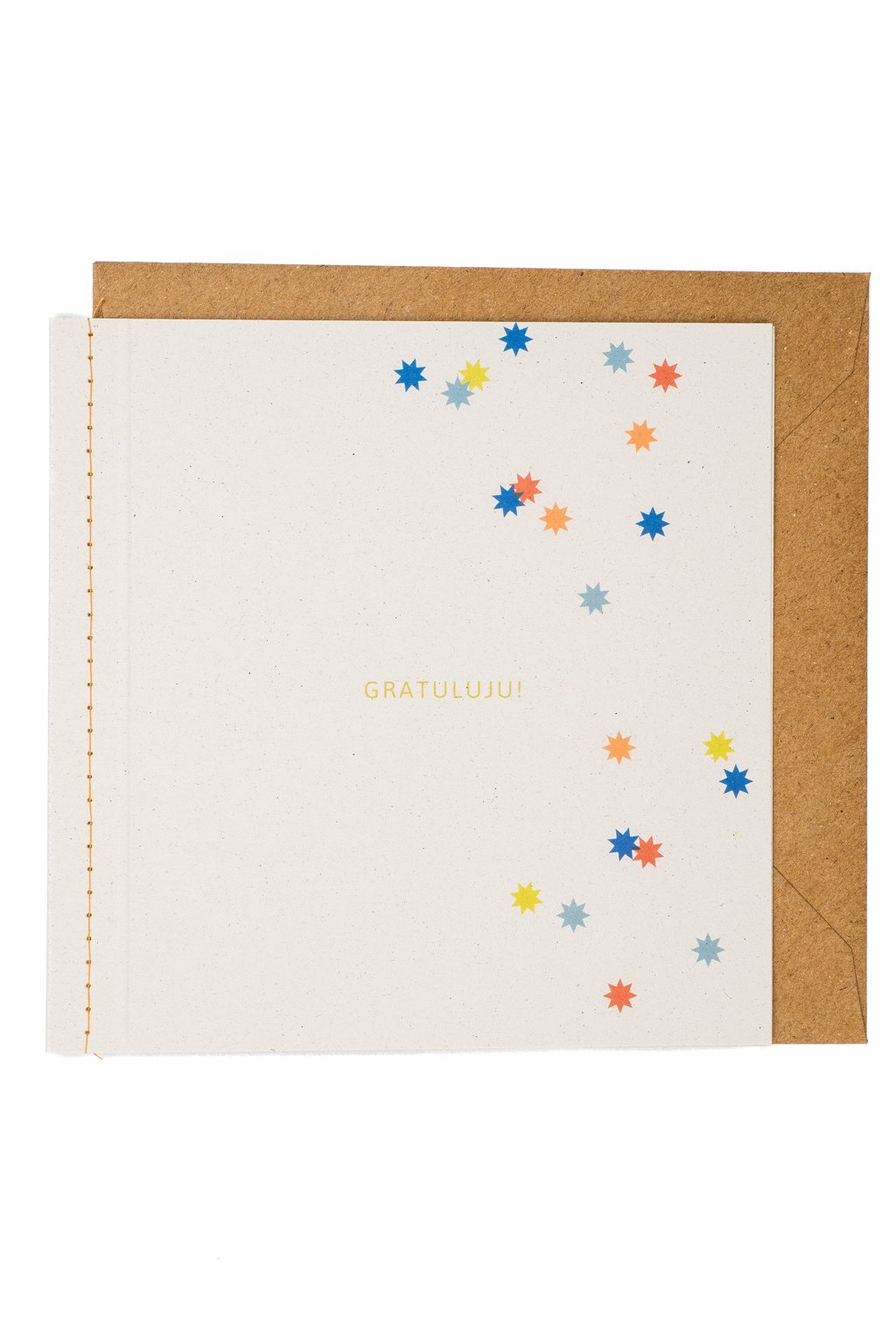 Blahoželanie s decentným oranžovým šitím pri chrbte k akejkoľvek radostnej udalosti - od narodenín, cez svadbu, narodenie bábätka až po odchod na cestu okolo sveta... Súčasťou priania je obálka z recyklovaného papiera.
