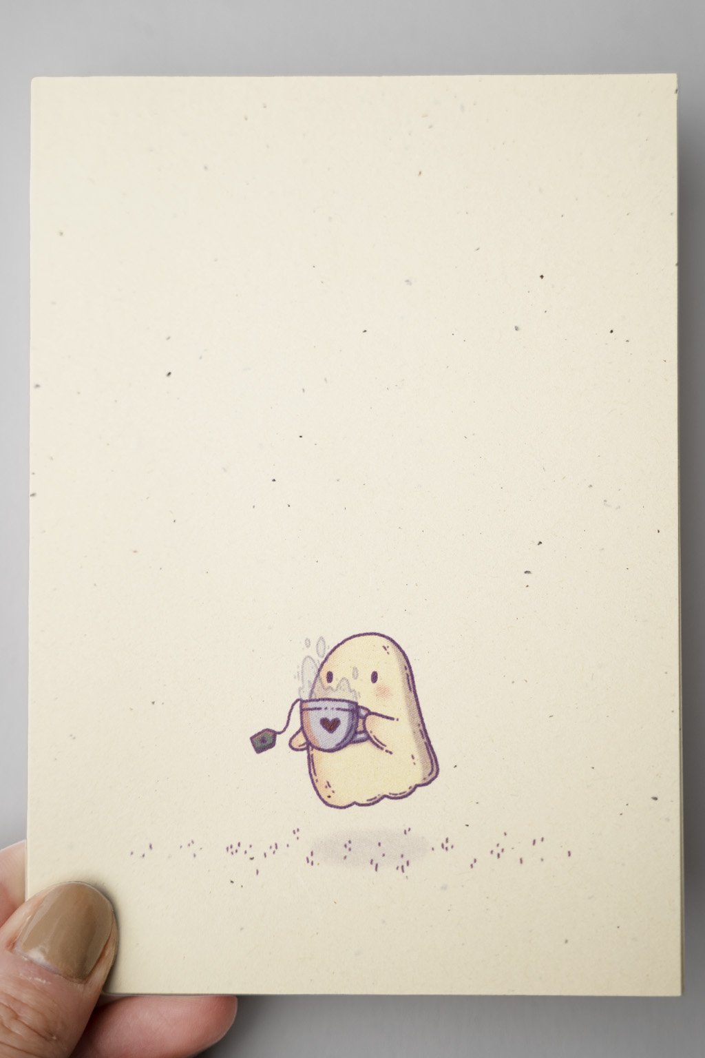 Potešte svojich blízkych autorským radostným prianím. Na prednej strane nájdete veselú autorskú ilustráciu ducha s čajom.