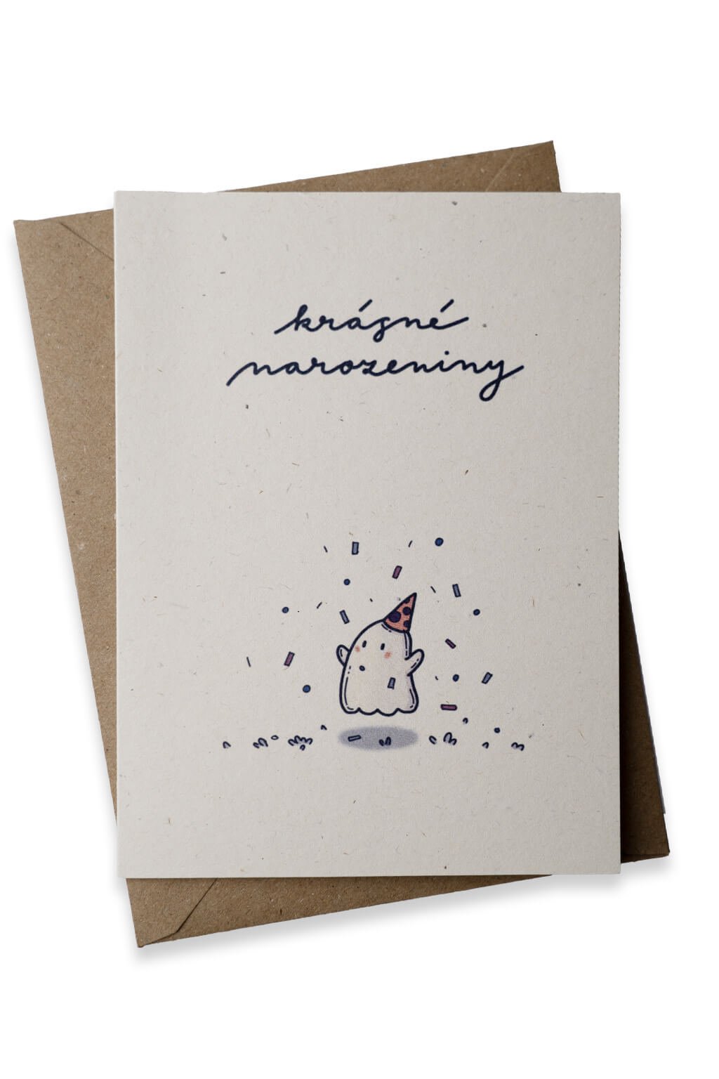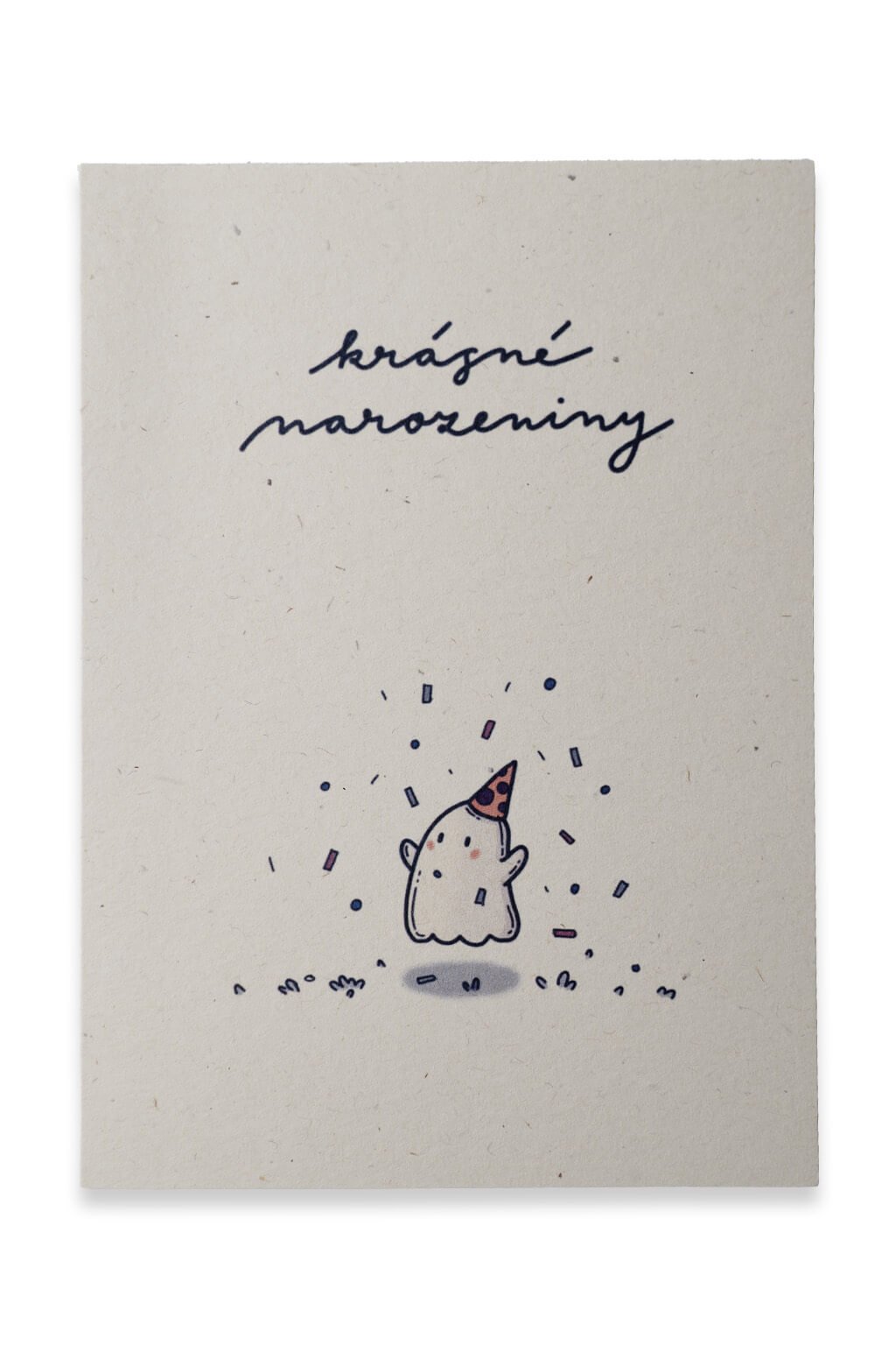 Potešte svojich blízkych originálnym a veselým prianím k narodeninám. Na prednej strane nájdete veselú autorskú ilustráciu ducha s konfetami a textom "krásne narodeniny".