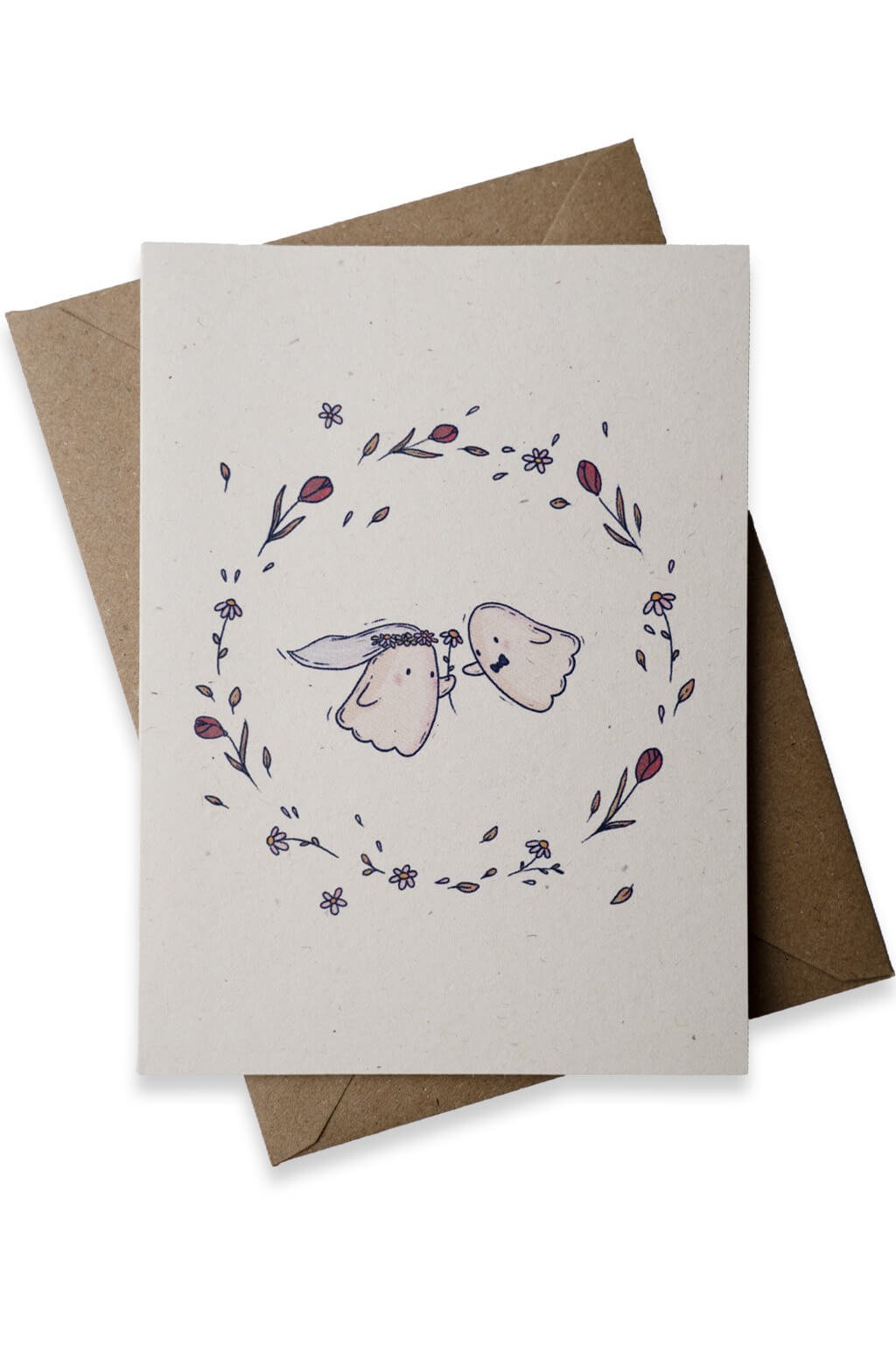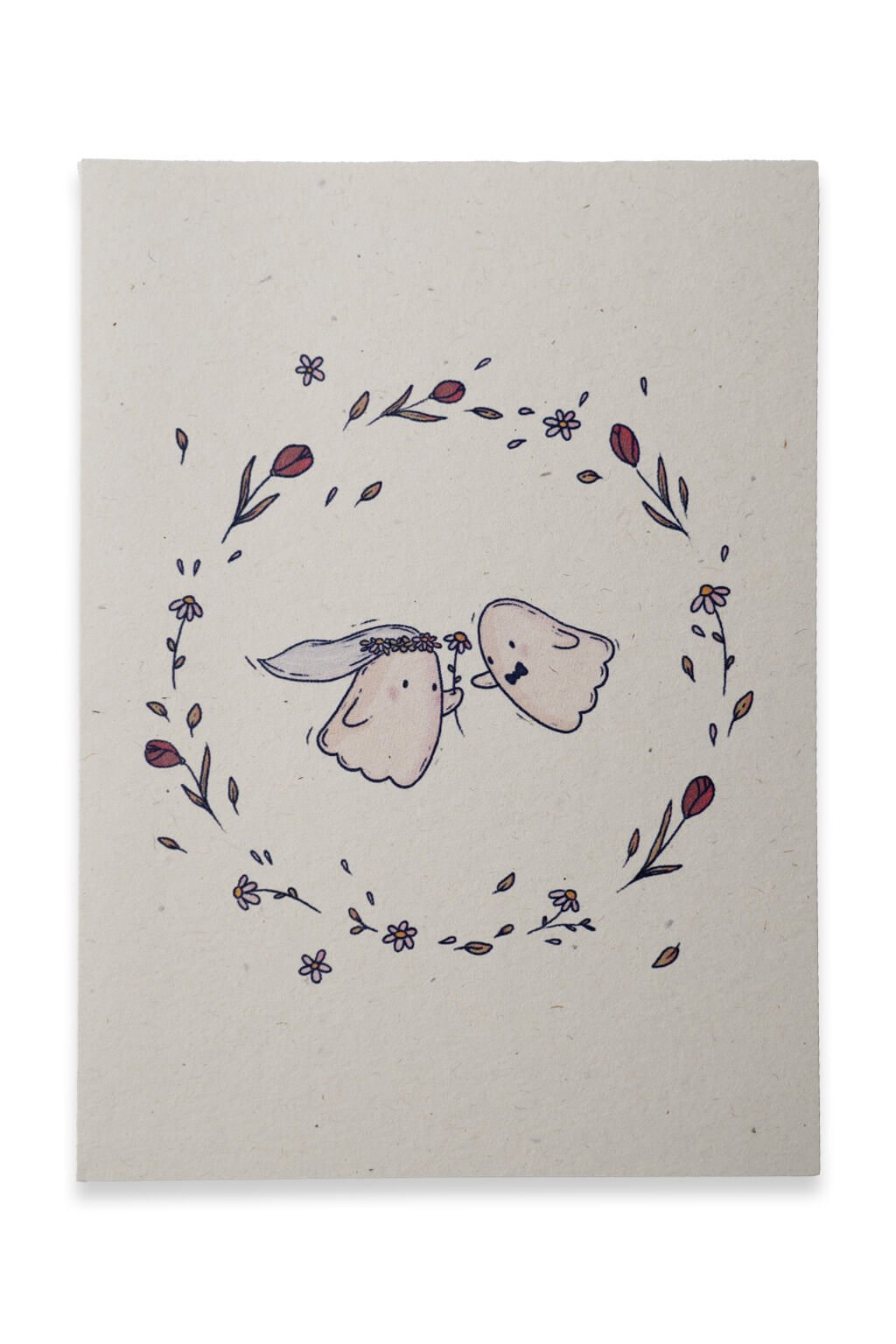 Pogratulujte novomanželom romantickým svadobným prianíčkom s autorskou ilustráciou dvoch zamilovaných duchov. Na prednej strane blahoželania je obrázok svadobného páru, tancujúceho uprostred kruhu plného kvetov.