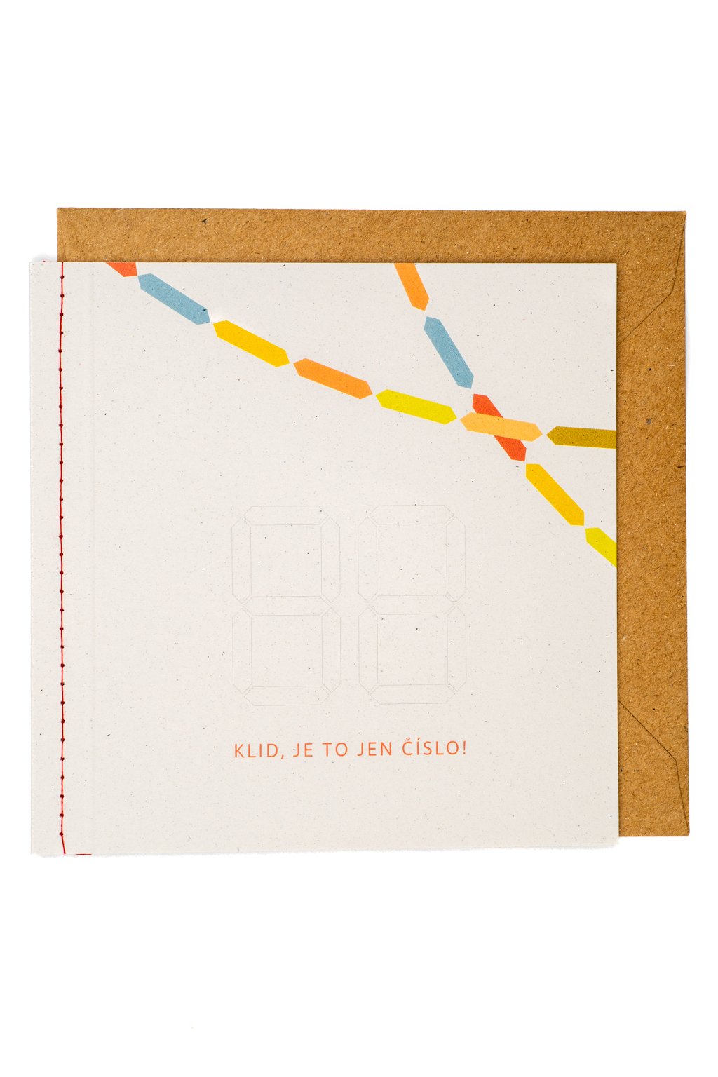 Blahoželanie s decentným oranžovým šitím pri chrbte k narodeninám. Súčasťou priania je obálka z recyklovaného papiera.
