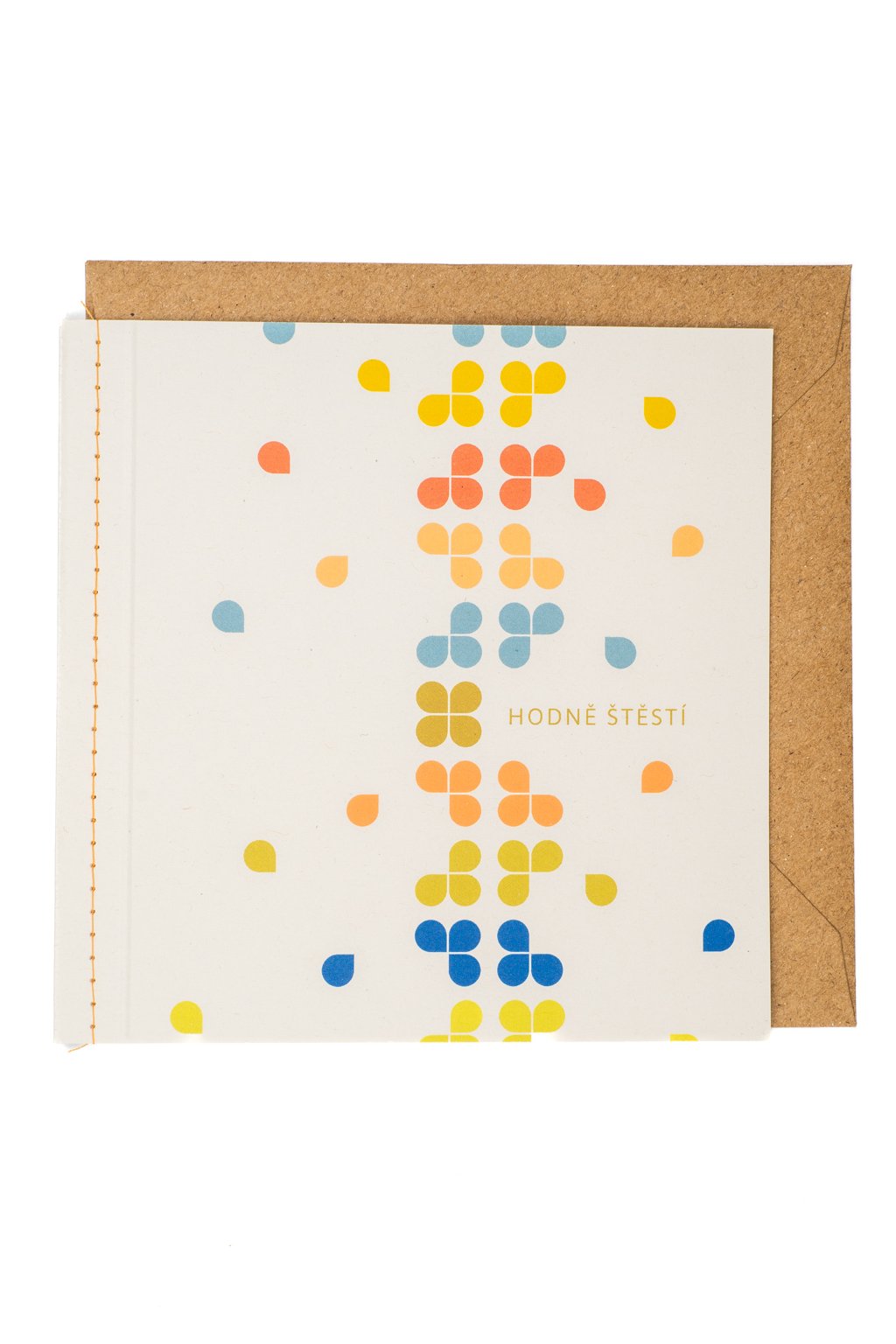 Blahoželanie s decentným oranžovým šitím pri chrbte k narodeninám. Súčasťou priania je obálka z recyklovaného papiera.