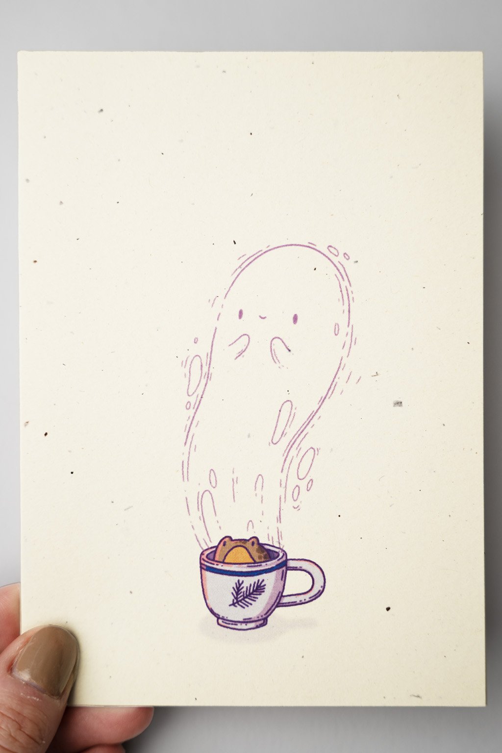 Originálne autorské blahoželanie s duchom a žabkou v hrnčeku.