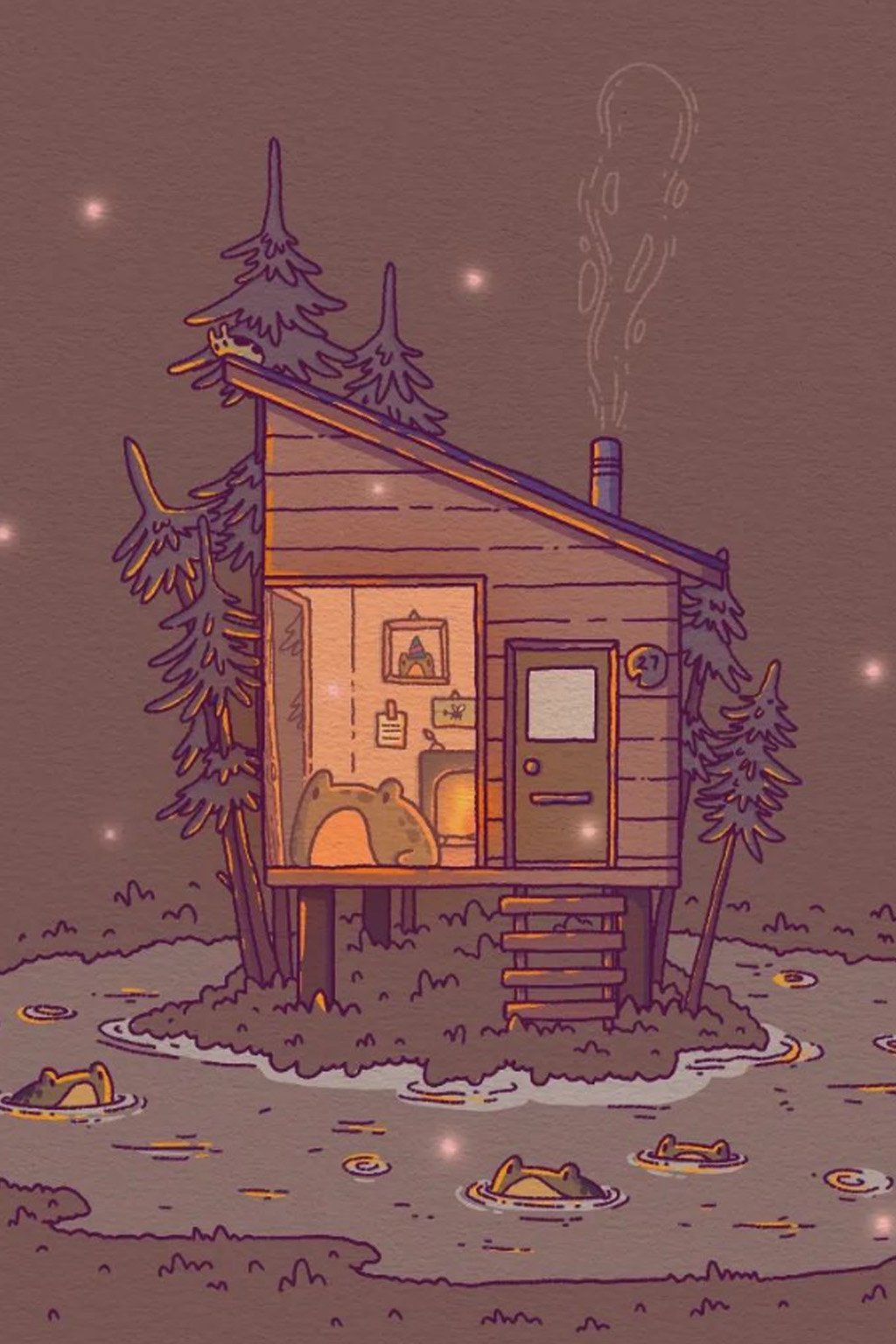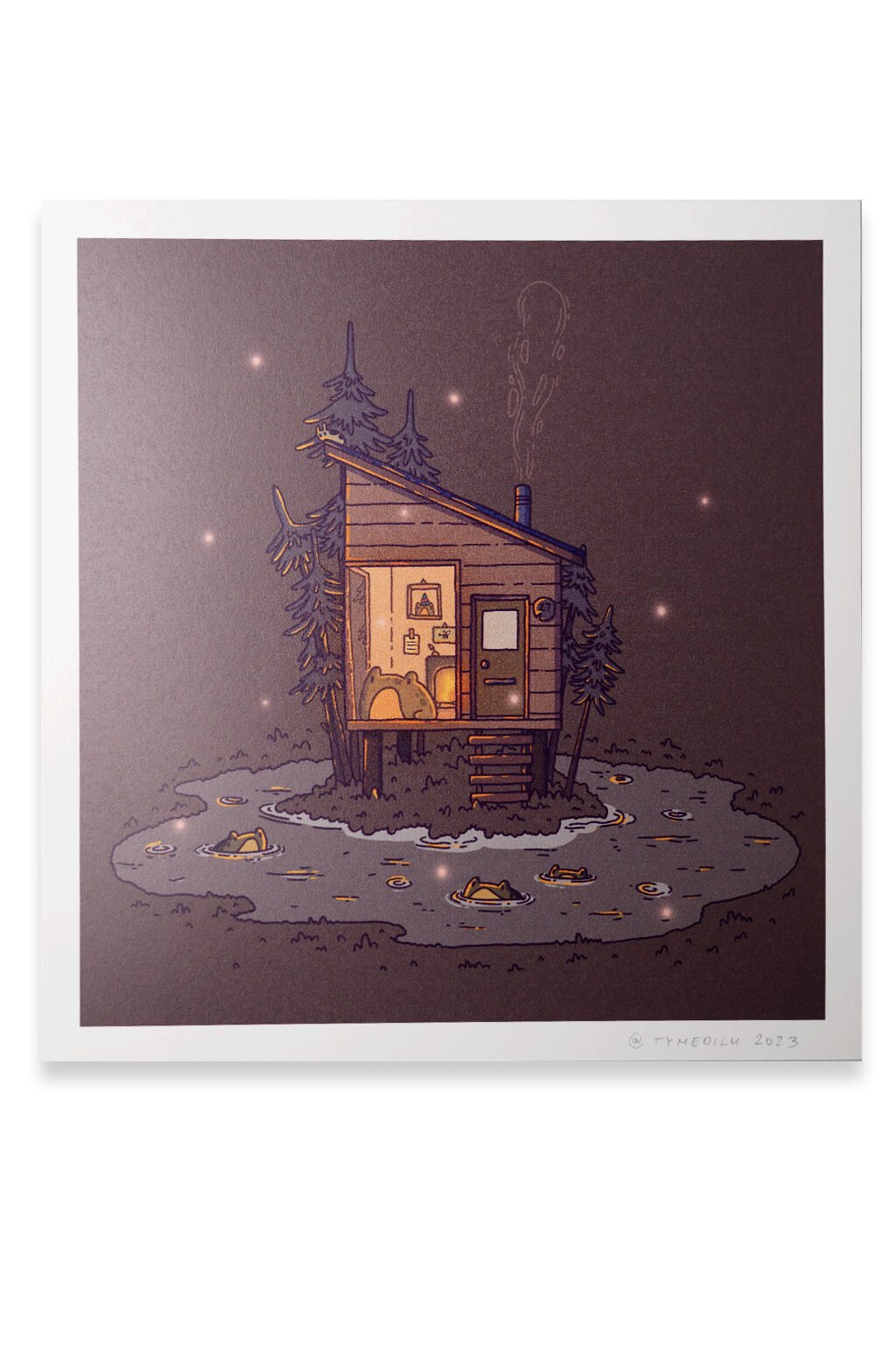 Originálny autorský print s motívom lesného domčeka pre žabky.