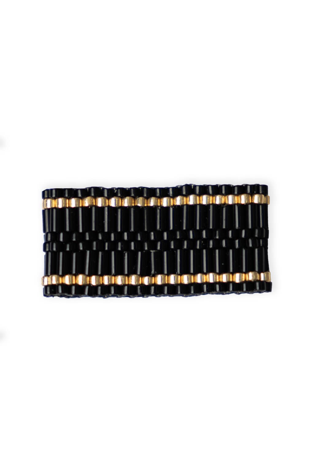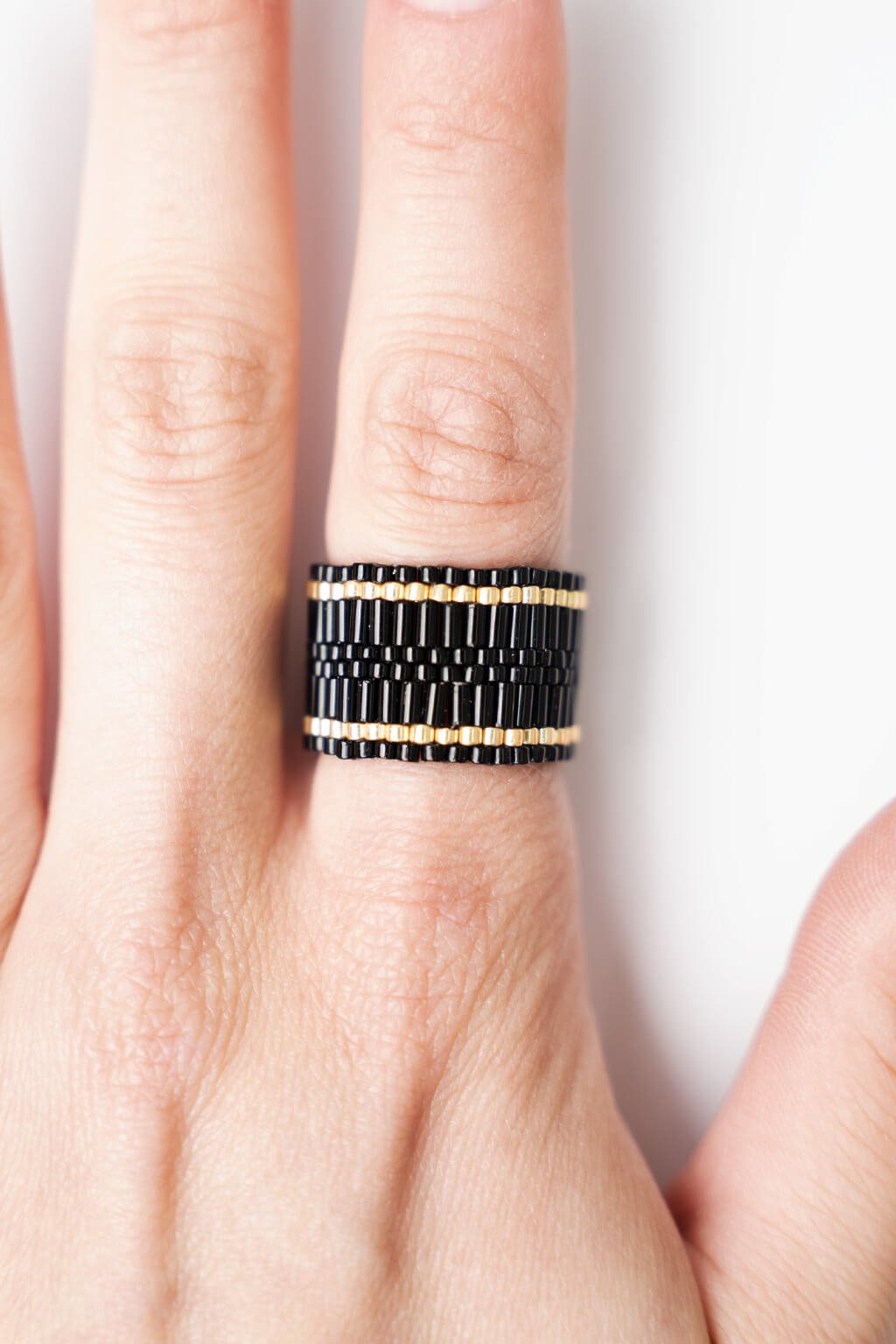 Lesklé čierne koráliky s doplnkom zlatých prúžkov tvoria z prstienka jemný a predsa sofistikovane výrazný šperk. Prsteň nie je iba oku lahodiacim doplnkom, ale tiež pohodlným na nosenie vďaka svojej ľahkosti a pevnej konštrukcii.