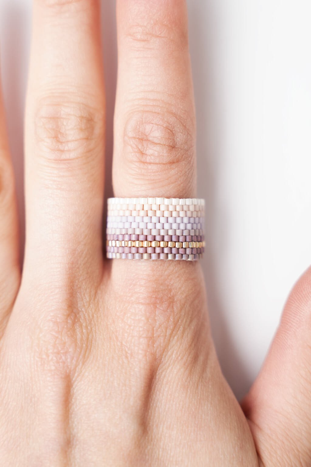 Ručne šitý korálkový prsteň od značky Rozárka v nežných fialových odtieňoch v sebe spája jemnosť a sofistikovanosť. Vďaka starostlivému výberu japonských korálikov a precíznemu spracovaniu ponúka šperk nielen krásny vzhľad, ale aj pohodlné nosenie.
