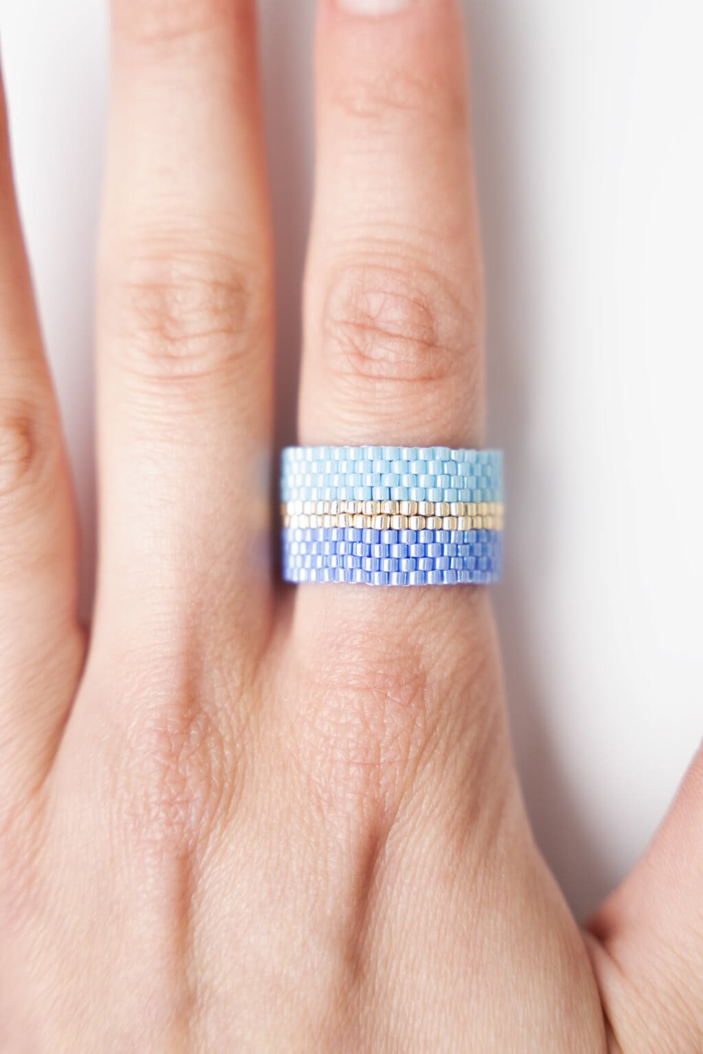 Ručne šitý korálkový prsteň od značky Rozárka v nežných modrých odtieňoch v sebe spája jemnosť a sofistikovanosť. Vďaka starostlivému výberu japonských korálikov a precíznemu spracovaniu ponúka šperk nielen krásny vzhľad, ale aj pohodlné nosenie.