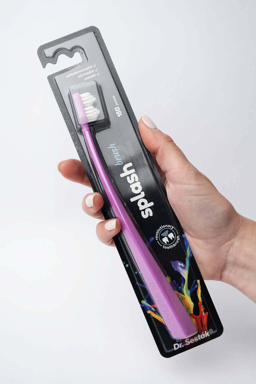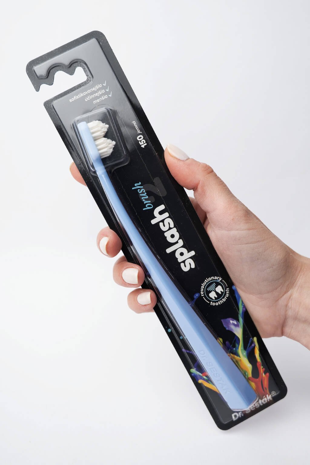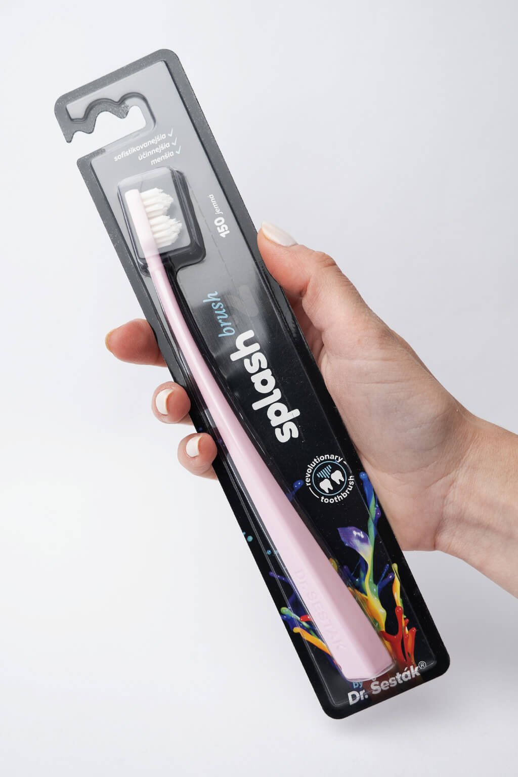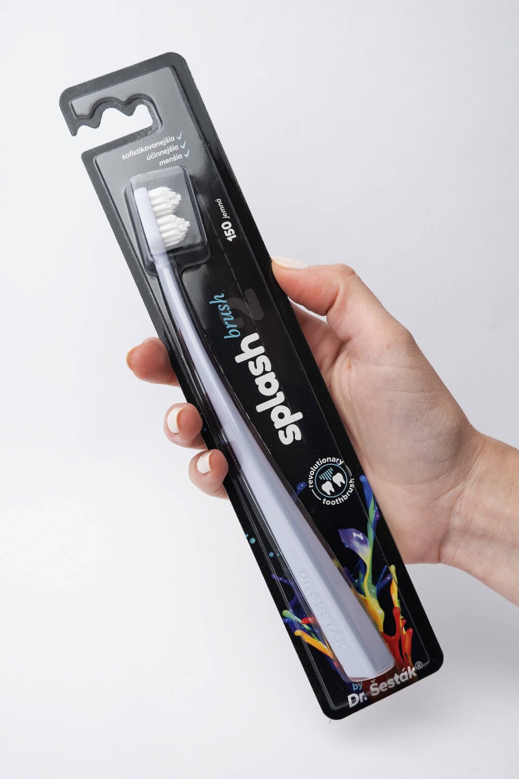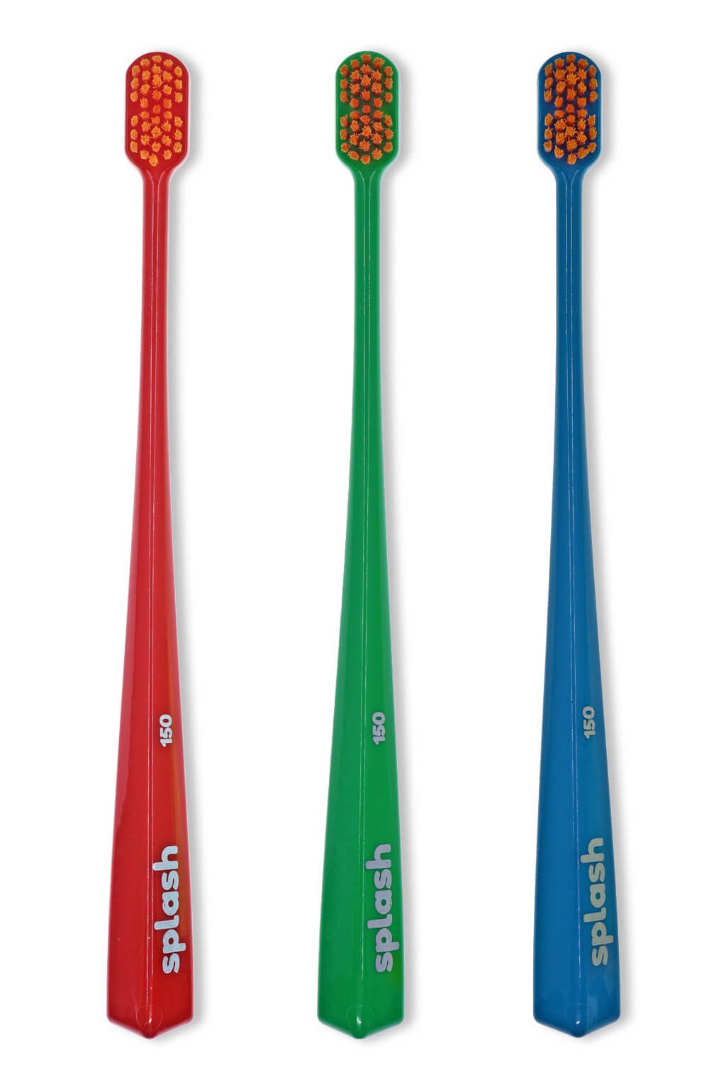Kefka na zuby Splash brush 150 je vybavená štetinami o hrúbke 0,15 mm a 2 pyramídovým tvarom hlavičky. Jej pružná ohnutá rukoväť zabezpečuje dokonalé čistenie zubov, takmer kompletnú čistotu medzizubných priestorov a ďasien. Splash Brush ľahko dosiahne do každého kúta, vrátane zadnej steny zubov.