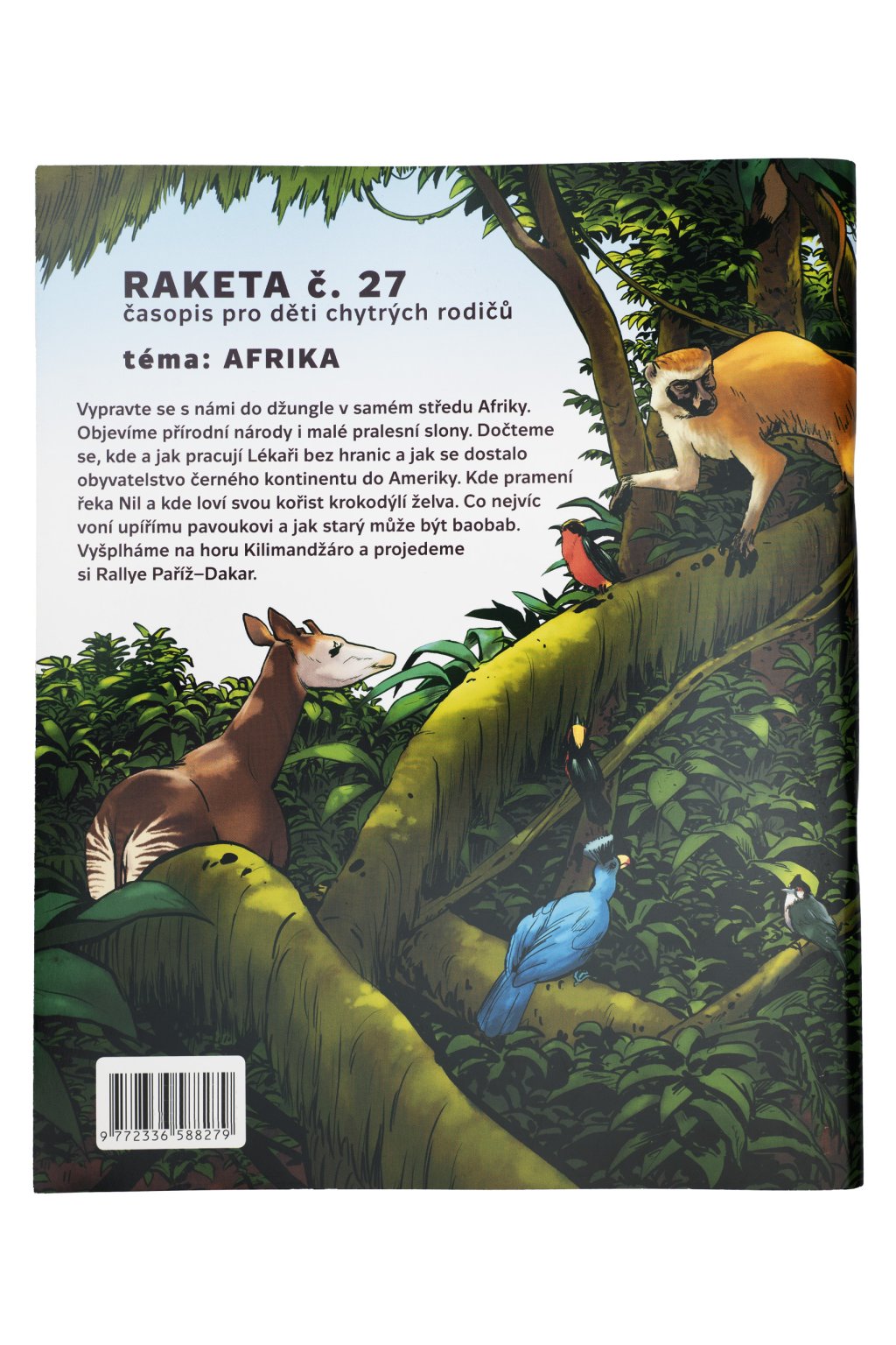 Vypravte sa s nami do džungle v samom strede Afriky. Objavíme prírodné národy aj malé pralesné slony. Dočítame sa, kde a ako pracujú Lekári bez hraníc a ako sa dostalo obyvateľstvo čierneho kontinentu do Ameriky. Kde pramení rieka Níl a kde loví svoju korisť krokodília korytnačka. Čo najviac vonia upíriemu pavúkovi, ako starý môže byť baobab a z čoho sa vyrobí eko peňaženka. Vyšplháme na horu Kilimandžáro a prejdeme si Rallye Paríž–Dakar. Obálku nakreslil Karel Osoha.