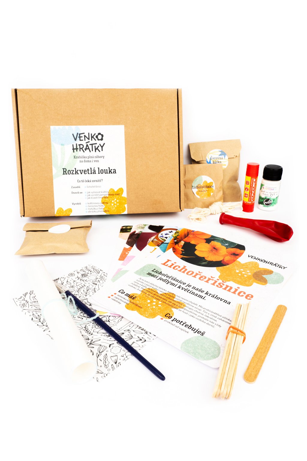 V tejto krabičke nájdete Rozkvitnutú lúku prežiarenú letným slnkom. Obklopíte sa kvetmi, ich vôňou a pestrými farbami. Môžete si ľahnúť len tak do trávy a pozorovať ubiehajúce baránky po oblohe. A alebo si zasadiť kapucínku, dôležitú kvetinu liečivku. S čarovnou paličkou si môžete s deťmi zahrať na víly alebo elfov, tajomných čarodejov aj čarodejnice. Z vylisovaných kvetov vyrobíte servítkovou metódou nádhernú lampu a okenné ozdoby čiže lapače slnečných lúčov. A nesmieme zabudnúť ani na motýle z listov.