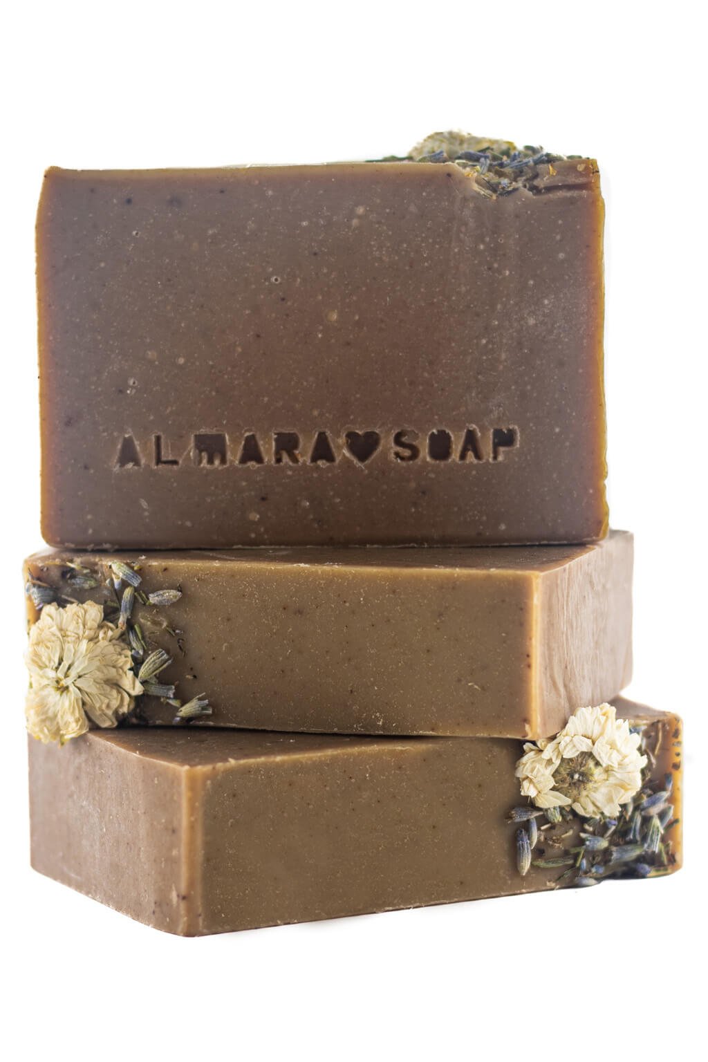 INCI: Aqua, Sodium sunflowerate, Sodium cocoate, Sodium palmate, Sodium olivate, Glycerin, Melia Azadirachta Seed Oil, Butyrospermum parkii Butter, Bertholletia Excelsa Seed Oil, Vinegar, Lavandula angustifolia Oil, Rosmarinus officinalis Leaf Oil, Lavandula angustifolia Flower, Anthemis nobilis Flower, Cassia obovata Leaf Powder, Hedychium spicatum Root, Withania somnifera Root, Emblica officinalis Fruit Powder, Acacia concinna fruit powder, Mentha piperita Oil, Linalool, Urtica dioica Extract, Mentha piperita Extract, Humulus lupulus Flower Extract, Betula pendula Leaf Extract, Lavandula angustifolia Flower Extract, Equisetum arvense Extract, Rosmarinus officinalis Extract, Limonene