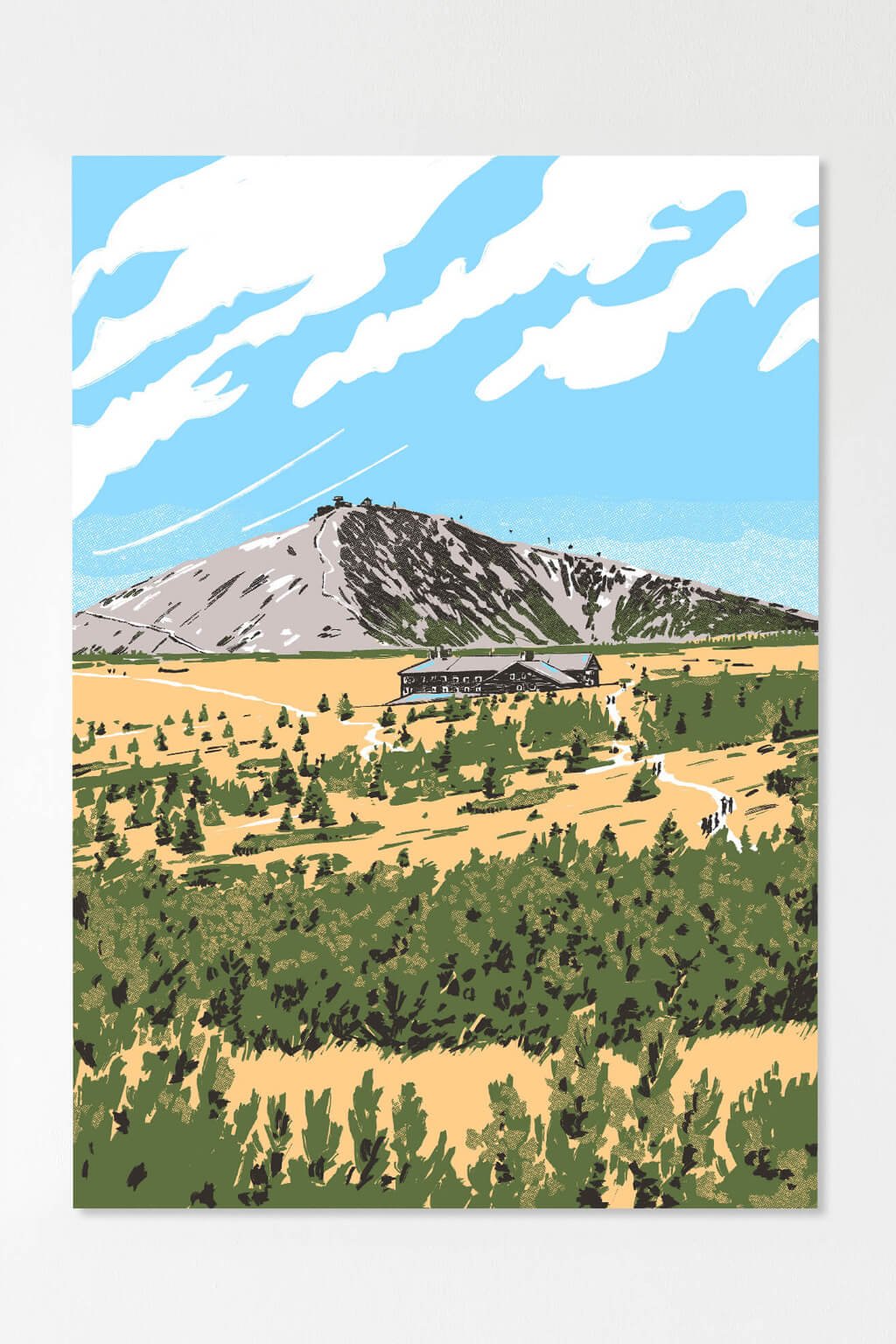 Po úspechu prvého plagátu Sněžky od Martina Paseku predstavujeme druhú ilustráciu legendárneho českého vrchu. Skalnatý vrchol ponúka rozsiahly kruhový výhľad, vďaka čomu je vyhľadávaným turistickým cieľom. A ak sa ti zachce, môžeš odtiaľ poslať pohľadnicu z najvyššie položenej poštovne v Českej republike. Tentokrát sa jej ujala ilustrátorka Martina Fischmeister.
