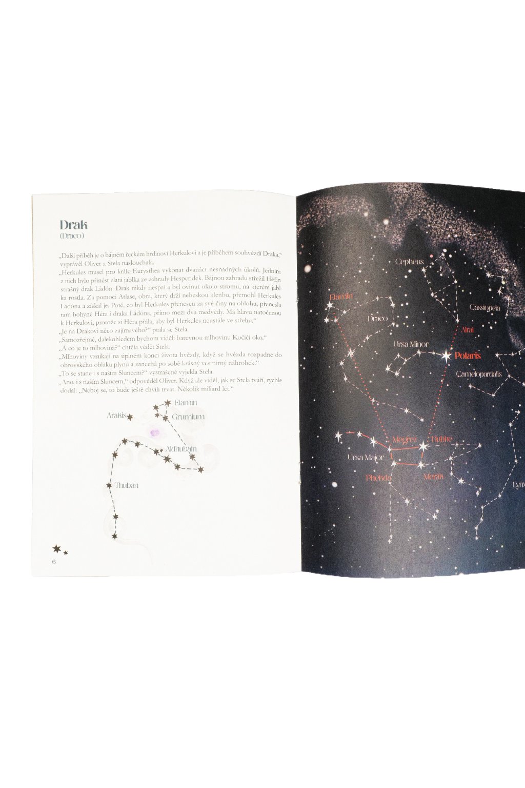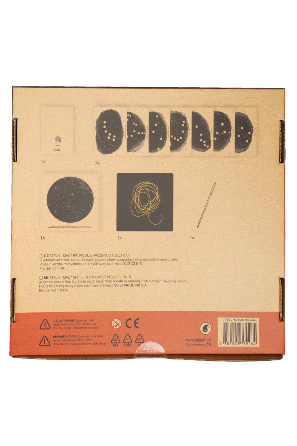 Sada obsahuje príručku Malý sprievodca hviezdnou oblohou ISBN 9788090739239, 7 kariet (Veľká medvedica, Malý medveď, Drak, Kasiopeja, Céfeus, Žirafa a Rys), fluorescenčnú niť svietiacu v tme, kovovú ihlu, mapu hviezdnej oblohy,