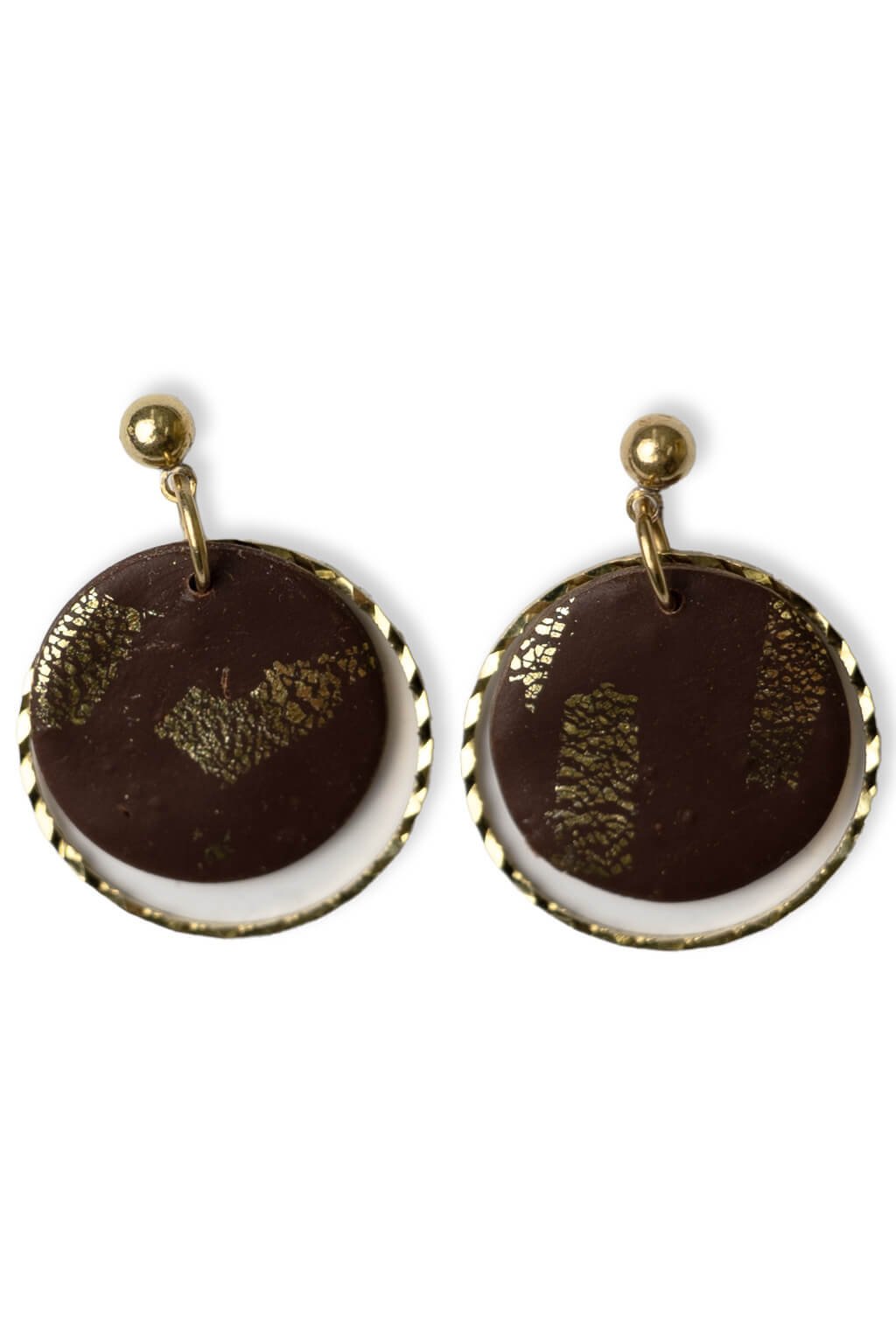 Čisté línie, abstraktné tvary a kvapka extravagancie, to sú hlavné atribúty týchto originálnych náušníc. Svojou decentnou výraznosťou a farebnosťou vnesú nezameniteľný štýl každému outfitu. Zaujmite svojou originalitou a doplňte svoj look týmto výnimočným kúskom vyrobeným z hnedého polyméru s kvapkou zlata a z mosadze. Každý detail je premyslený a každý kúsok je ručne vyrobený s láskou.