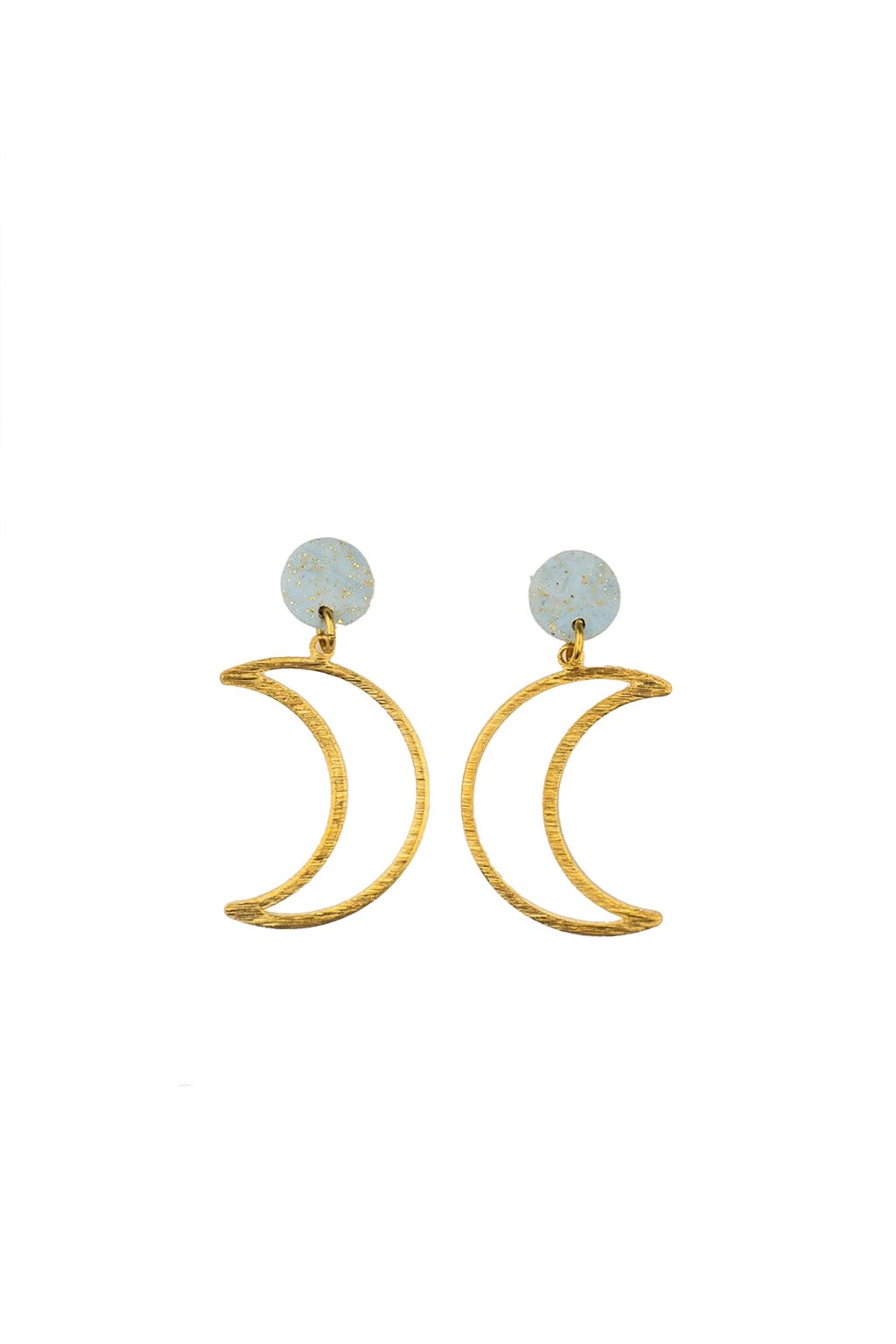 Kľúčovým rysom tohto unikátneho šperku sú čisté geometrické línie tvaru mesiaca a nádych neprehliadnuteľnej farebnej extravagancie. S ich subtílnym výrazom prinesiete do každého outfitu nezameniteľný štýl. Obohaťte svoj osobný look týmto jedinečným kúskom vyrobeným z jemne modrého polyméru s kvapkou trblietavého zlata a z mosadze, kde je každý detail starostlivo premyslený a každý kúsok je vyrobený s láskou a starostlivosťou.