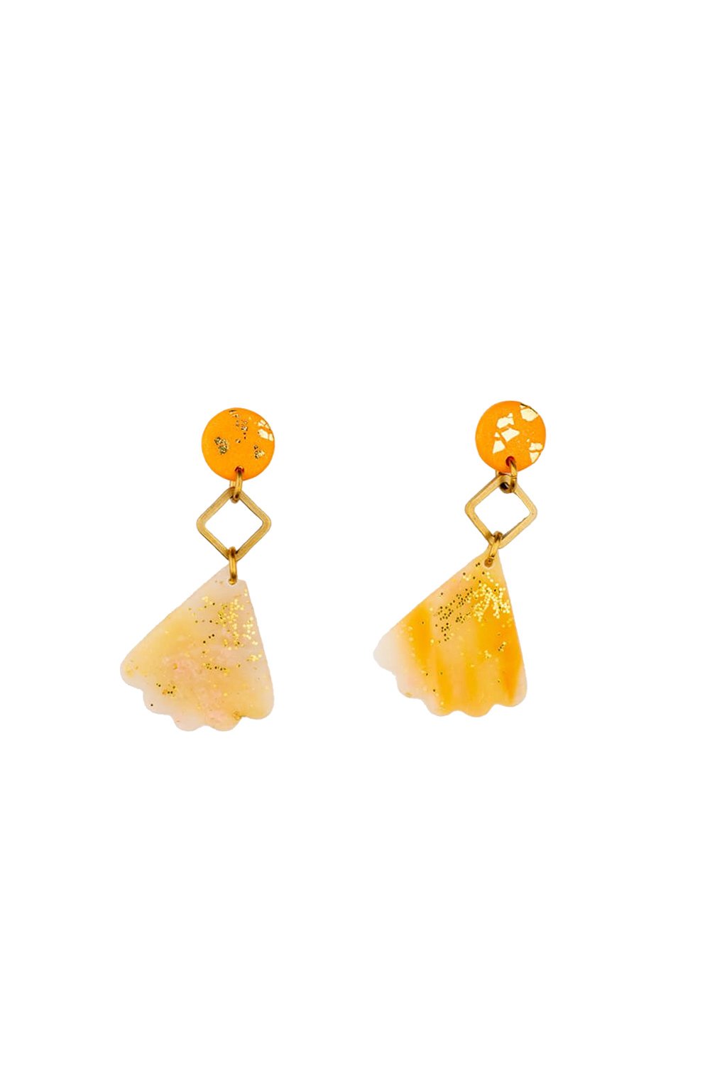 Čisté línie, abstraktné tvary a kvapka extravagancie, to sú hlavné atribúty týchto originálnych náušníc. Svojou decentnou výraznosťou a farebnosťou vnesú nezameniteľný štýl každému outfitu. Zaujmite svojou originalitou a doplňte svoj look týmto výnimočným kúskom vyrobeným z oranžového a slonovinového polyméru s kvapkou trblietavého zlata a z mosadze. Tento šperk vás okamžite prenesie do slnkom zaliateho leta.